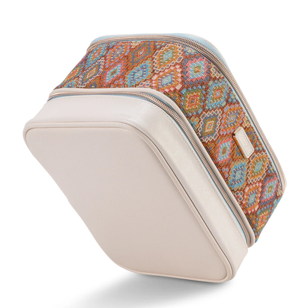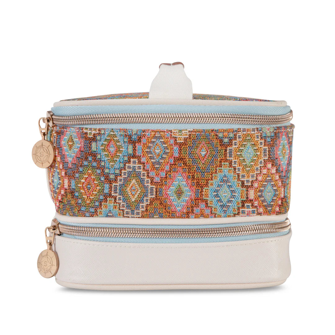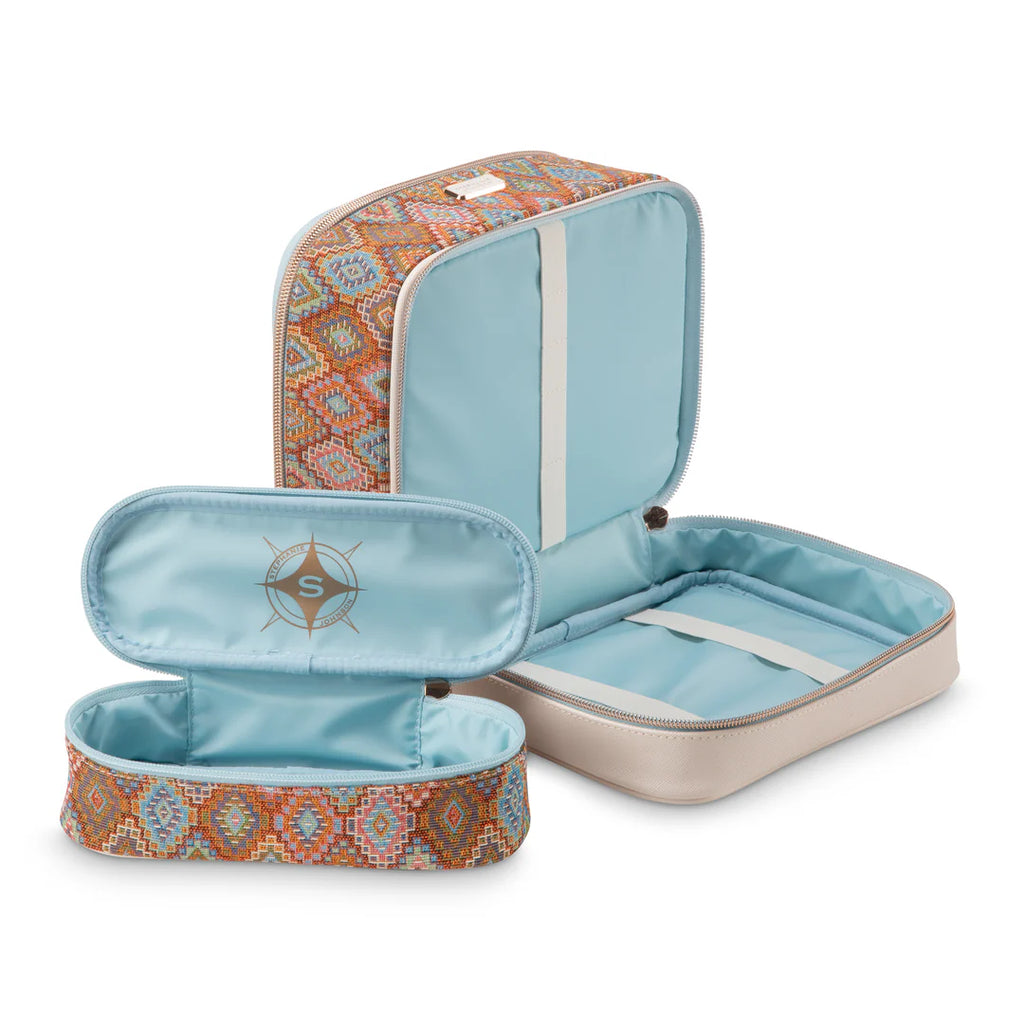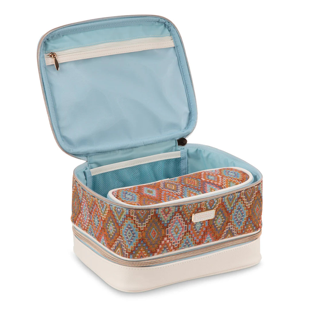 The Jenny has two separate packing compartments along with with a removable zippered pouch that can go anywhere. The Jenny has a roomy interior that keeps large and small items in place while the clear plastic lining provides an easy to clean surface! The top compartment features two mesh pockets for organization, along with a removable case. The bottom compartment has elastic straps to secure brushes, pallets, or other travel products, keeping them in a safe and secure location that reduces the rattling of your precious products.