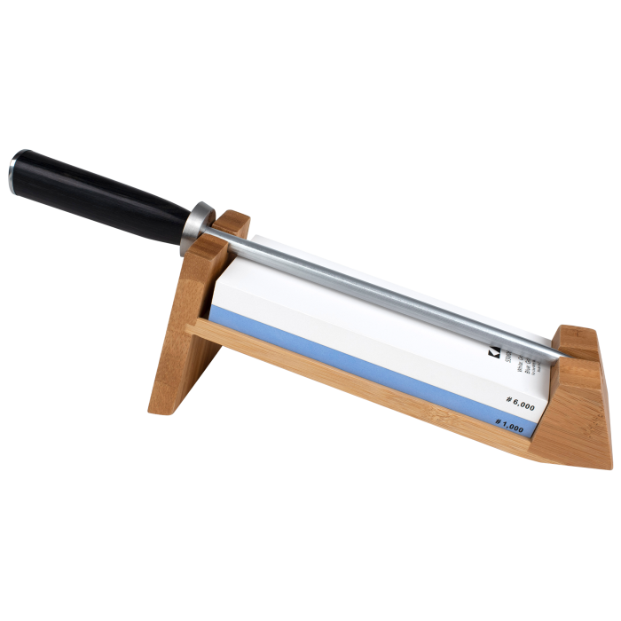 • Angled bamboo stand sets the whetstone and honing rod at a fixed 16° angle, complementing Shun knife edges