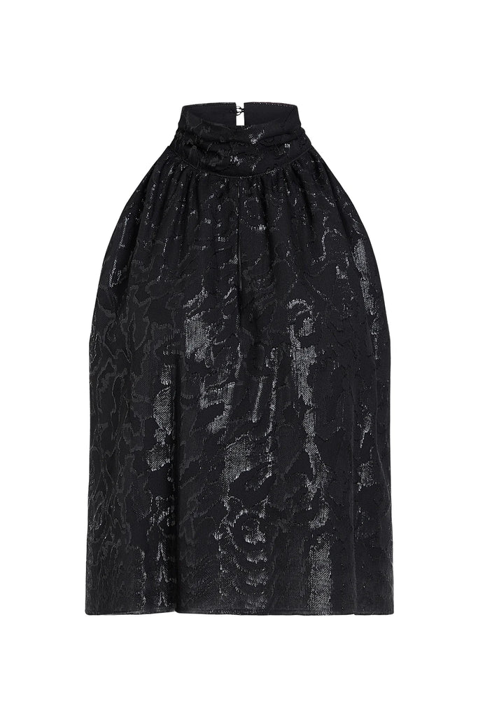 Crafted in black metallic clipped silk, the Goldie blouse balances texture, pattern, and subtle shimmer.
