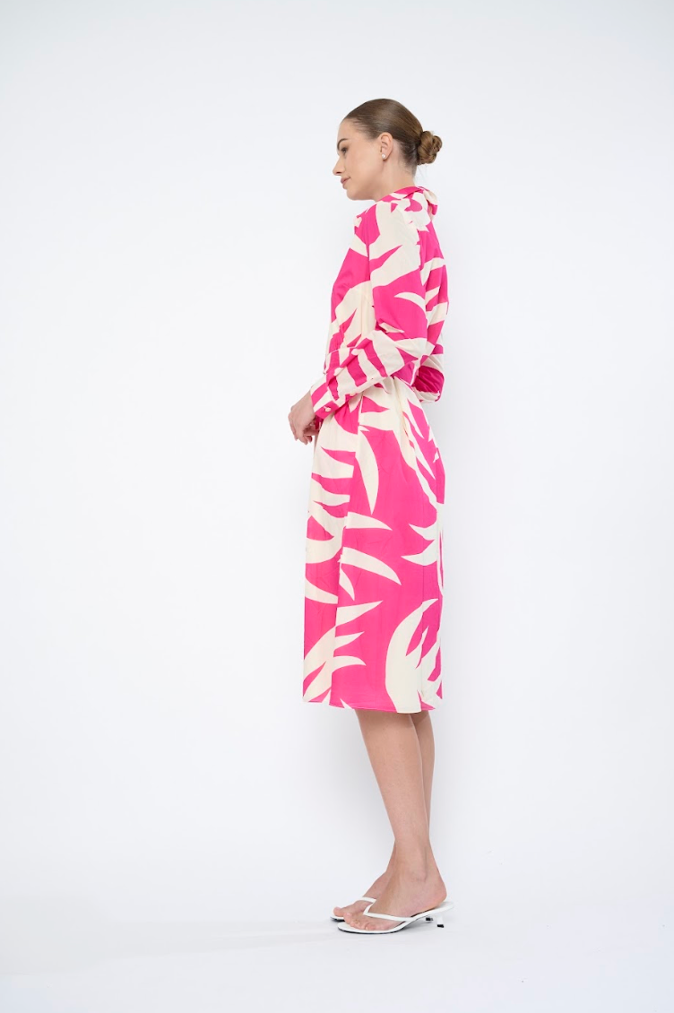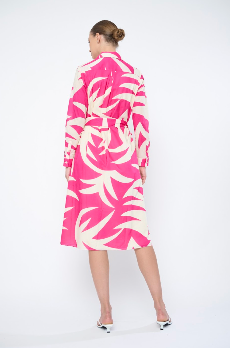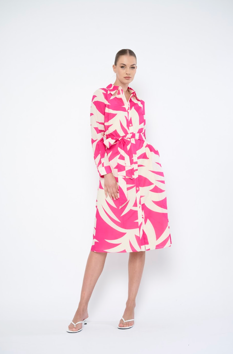 The Medora Dress combines effortless elegance with a flattering silhouette. This midi shirt dress features a classic button-front design and a cinched tie waist that defines your shape while maintaining a relaxed, sophisticated look. Perfect for transitioning from day to evening, it pairs beautifully with sneakers for casual outings or heels for more polished occasions. The midi length offers timeless versatility, making it a wardrobe essential that works across seasons.