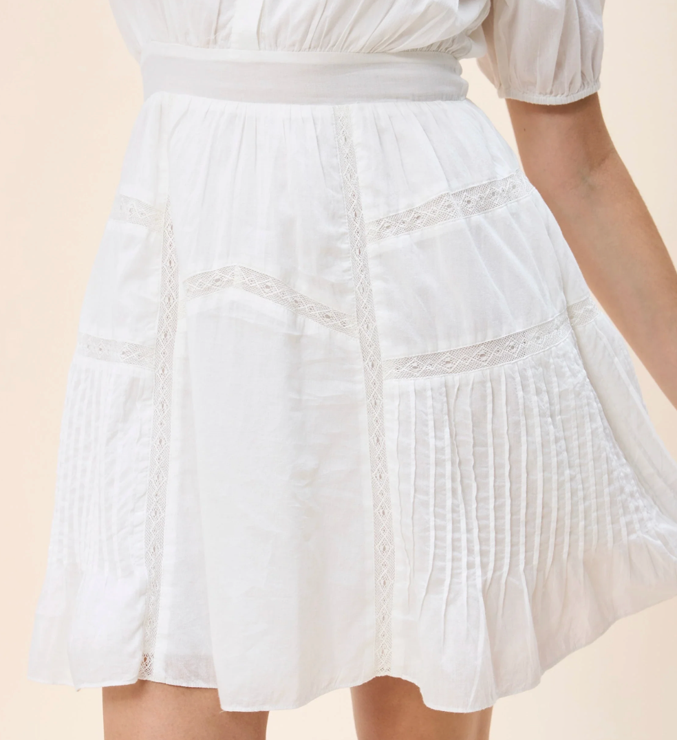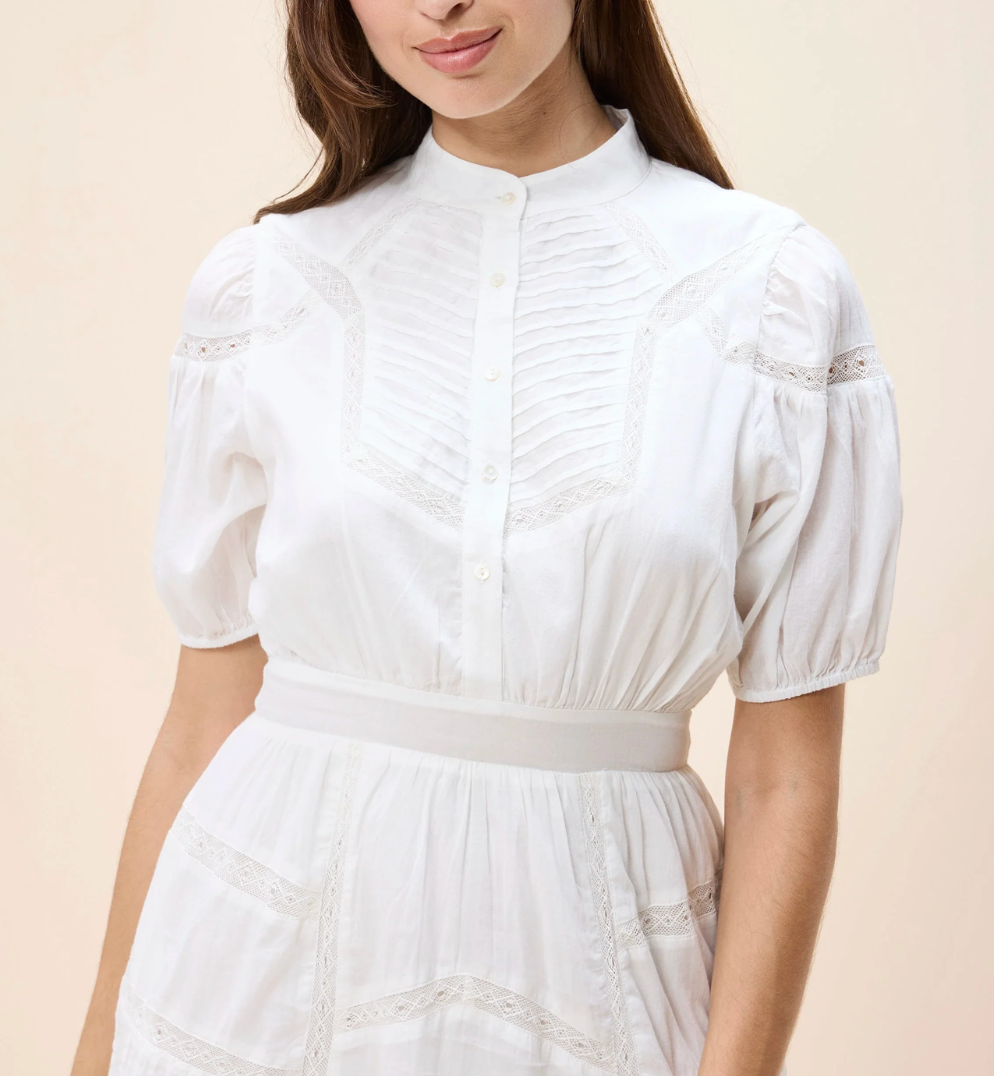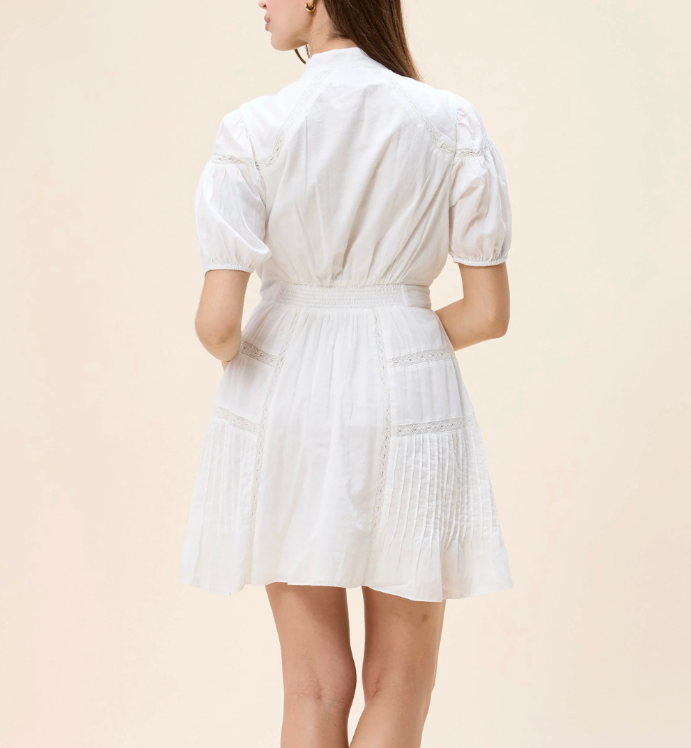 Meet the Signe Mini Dress, a playful yet polished statement piece. Designed with romantic puff sleeves, a row of buttons cascading down the front bodice, and delicate lace inserts for a soft feminine touch, this flirty mini is made to charm. Effortless and eye-catching, it’s the perfect dress for sunlit days and sweet spring nights.