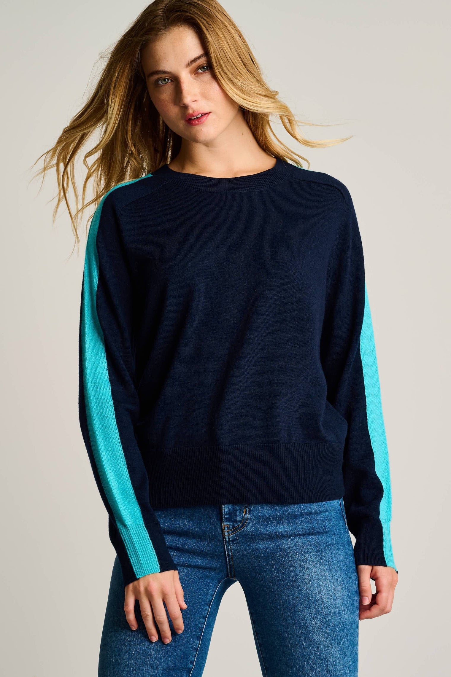 Graphic, clean, and modern, the Stripefull crewneck pullover redefines everyday stripes. Designed with contrast striping down the raglan sleeves and rib trim for structure, it’s equal parts sporty and sophisticated. Lightweight yet substantial, it’s the perfect sweater for layering across seasons.
