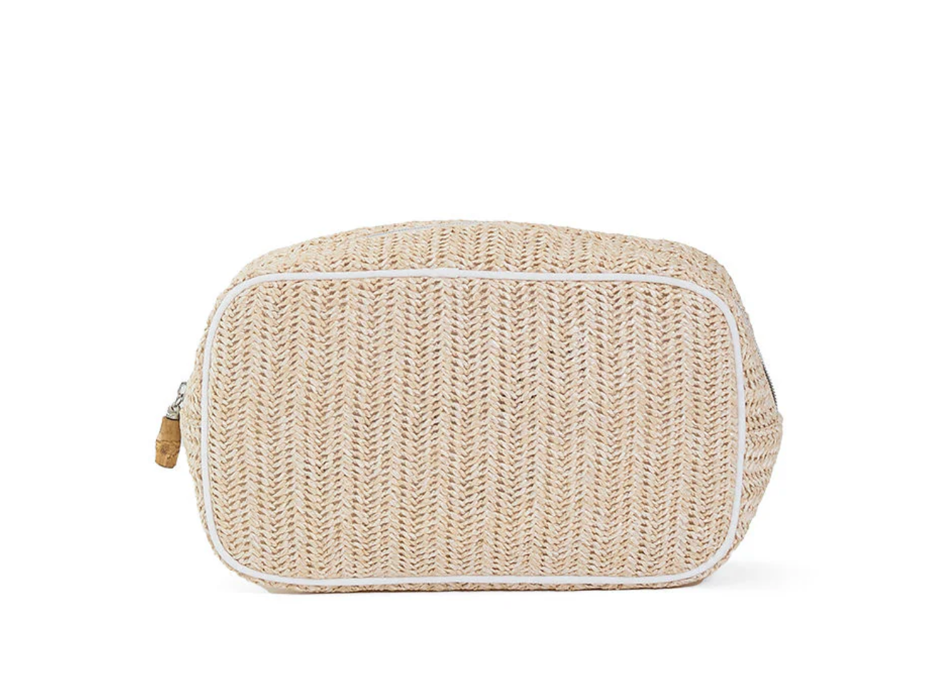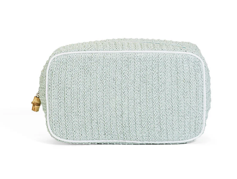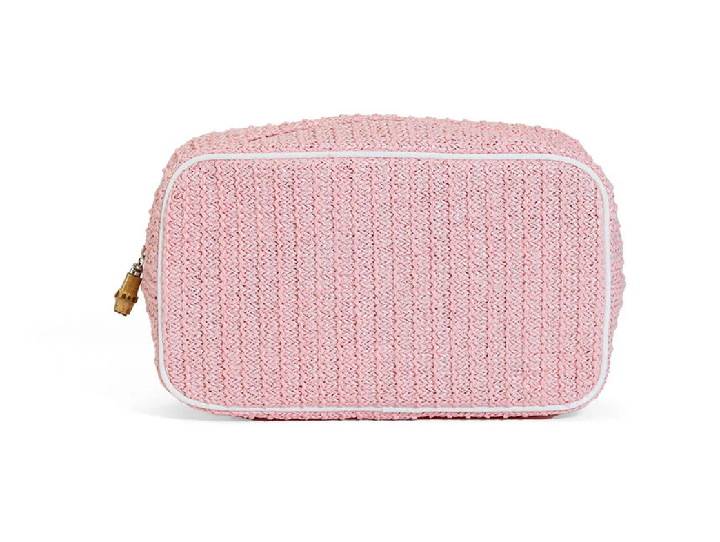 This beautiful straw GO Glam are perfect for makeup, makeup brushes, skincare products, nail polish, jewelry, and any additional accessories. With an open interior and back wall slip pocket this is the perfect catch-all to keep you organized.