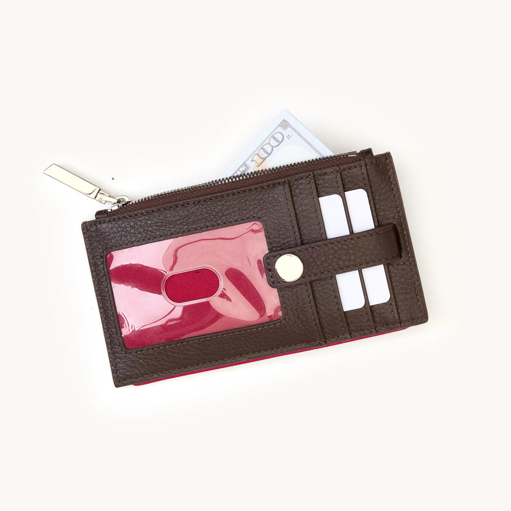 Stash credit and transit cards in up to 8 secure slots, and store meter change in one zippered pocket. Plus, enjoy a transparent ID slot when that cute bouncer asks for a peek at your license.