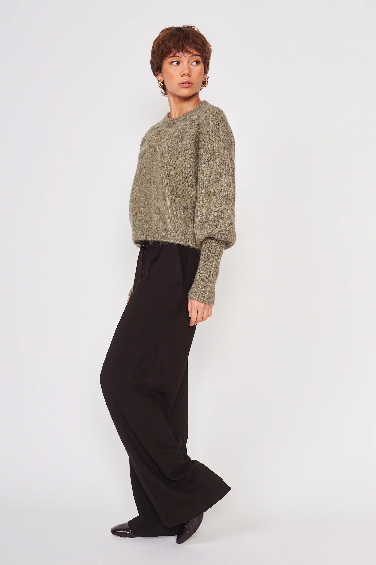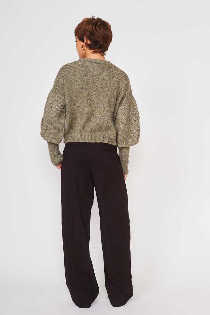 The Cynthia Sweater--with its delicate floral detailing and drop shoulder puff sleeve design—creates a look that is equal parts contemporary and cozy. Cut in a Moss knit fabric and finished off with classic rib trim, this sweater gives off a laid-back look of natural sophistication.