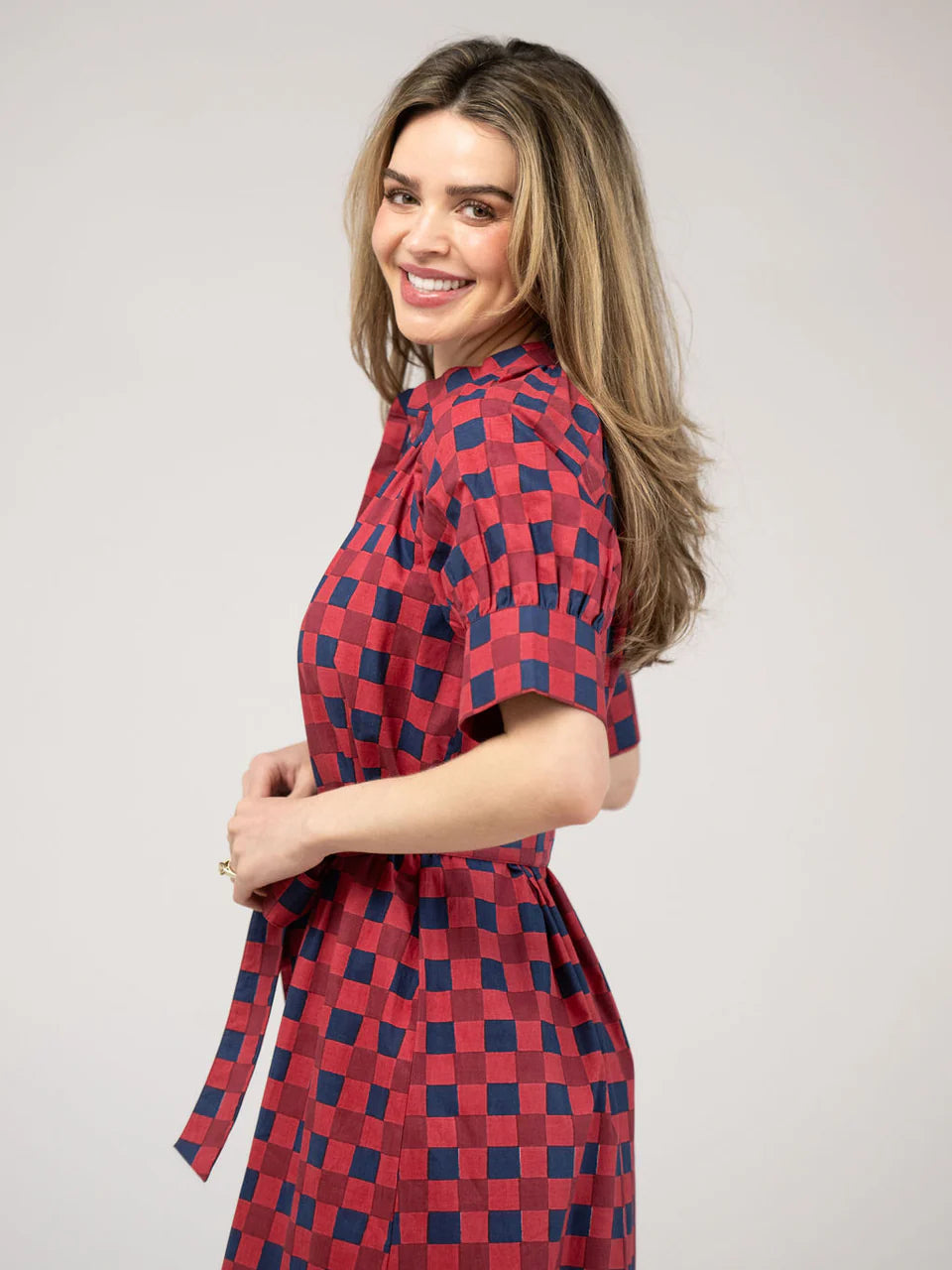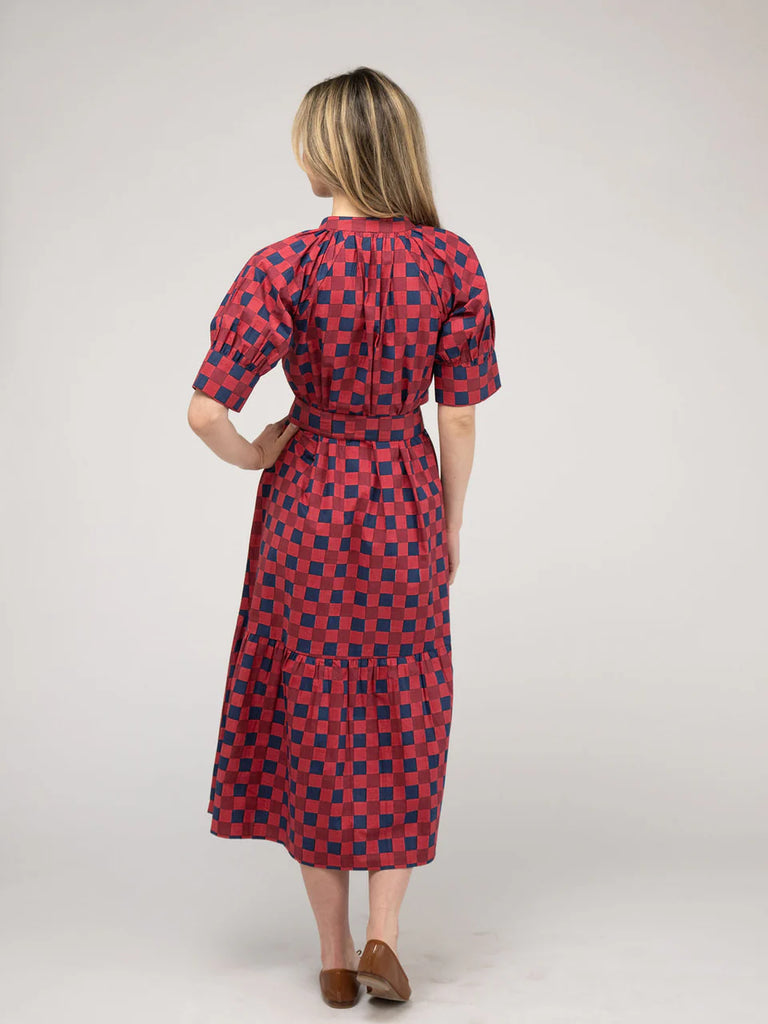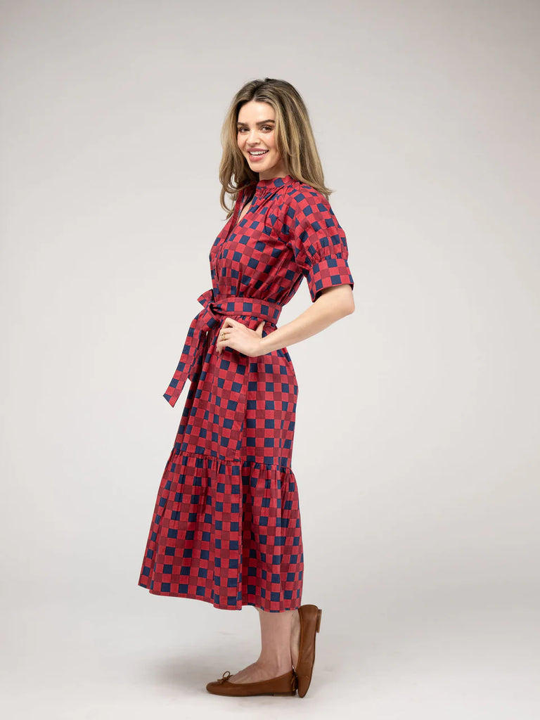 The Jane Dress features a v-neckline, quarter length sleeve and an optional belt and a playful ruffle hem.