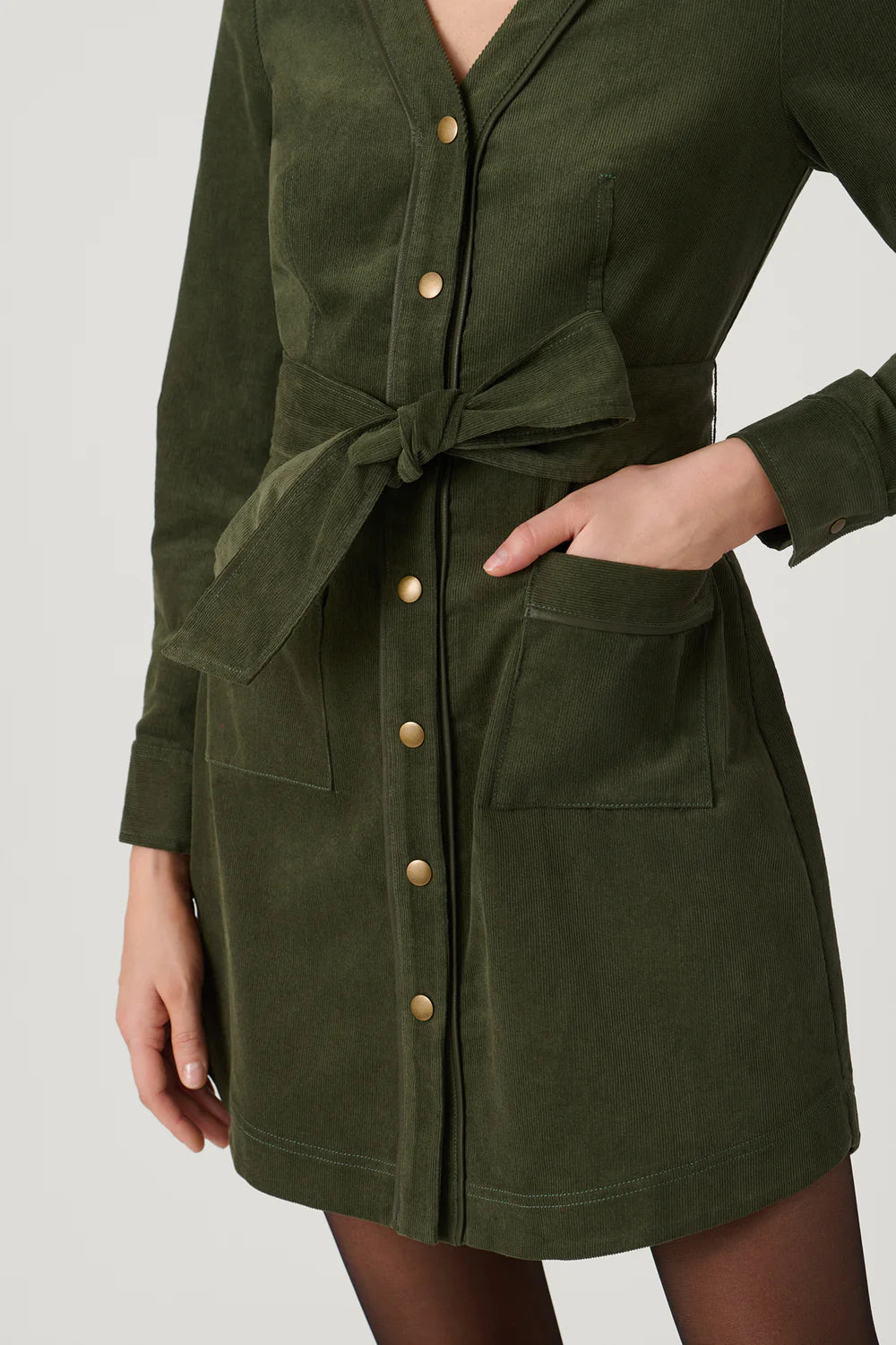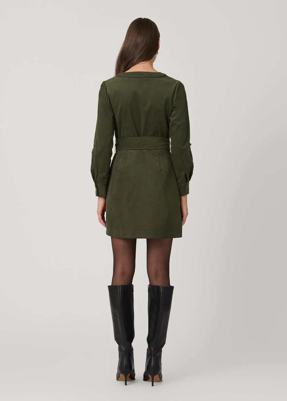 Effortless, V-neck mini dress in luxurious corduroy fabric. Neckline and front placket are accentuated with a faux-leather binding detail. Center front antique brass snap closure. Sleeves can be worn full length or rolled up with button tabs. Pocket detail on skirt. Curved hemline. Unlined.