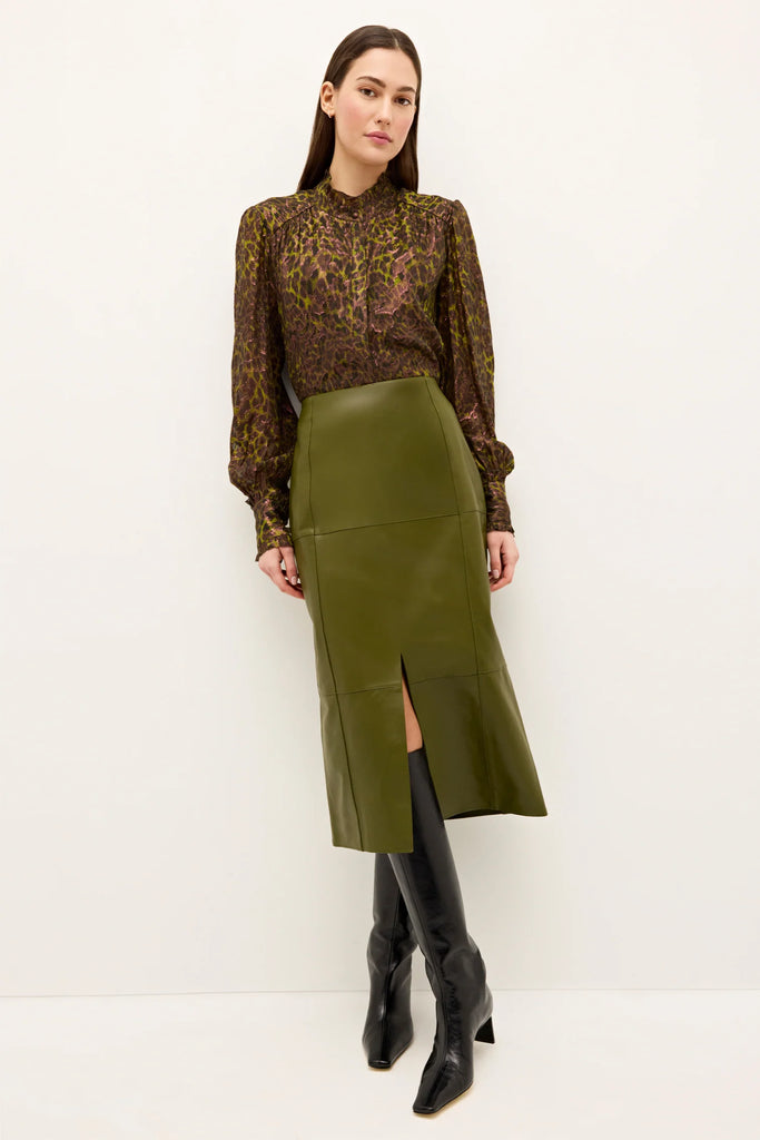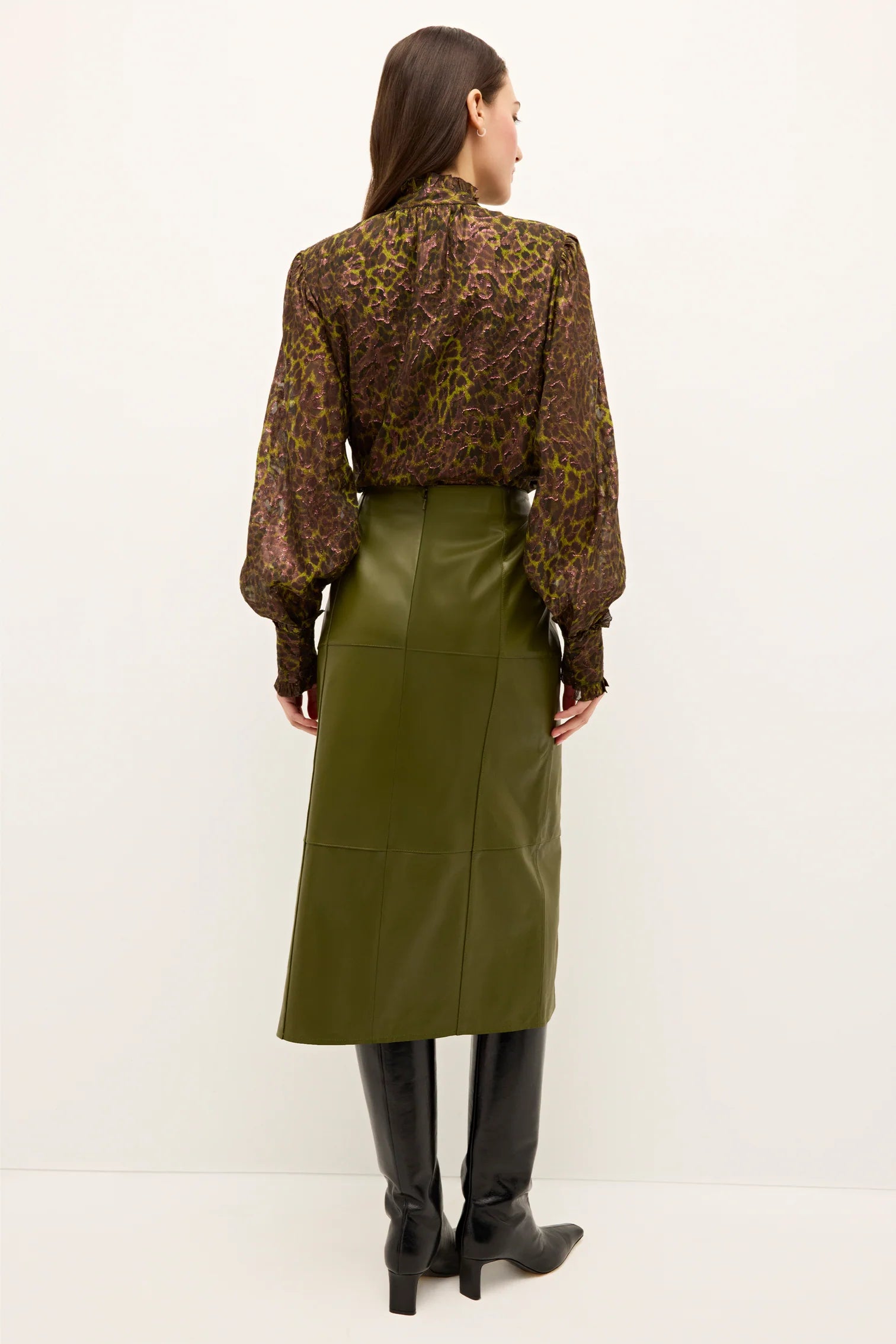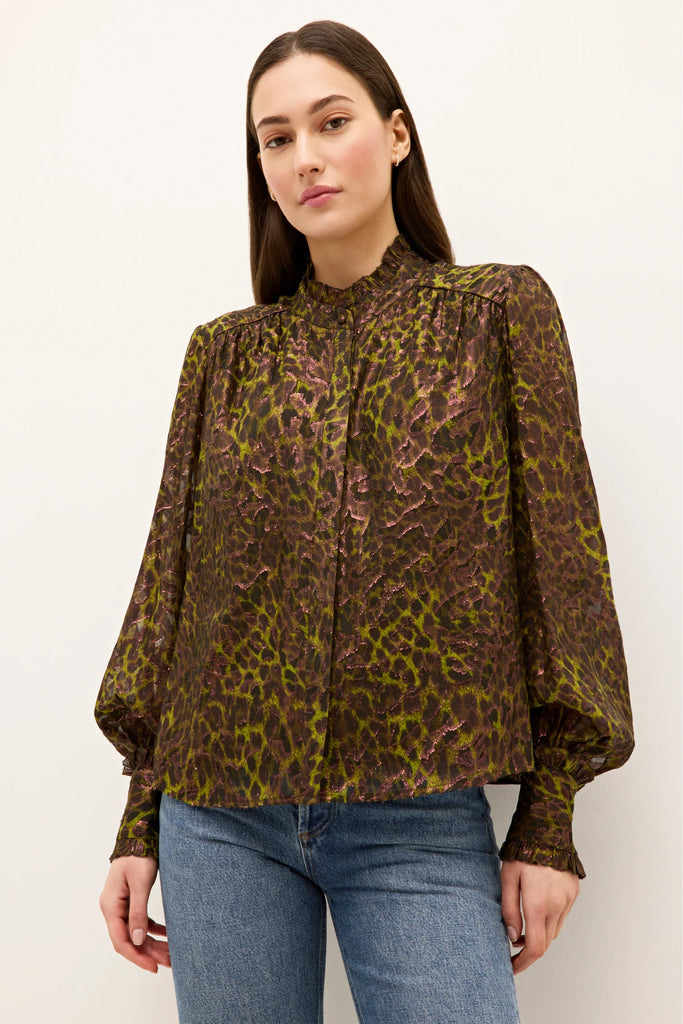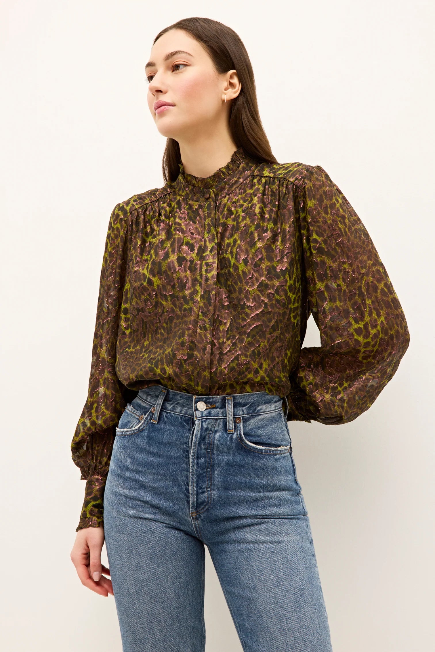 Your silk armor against the urban (or suburban) jungle, the Montana blouse takes on an ethereal effect with a pink metallic sheen that contrasts its powerful Grasslands print. A button-down staple with feminine details like ruffles at the collar and cuffs.