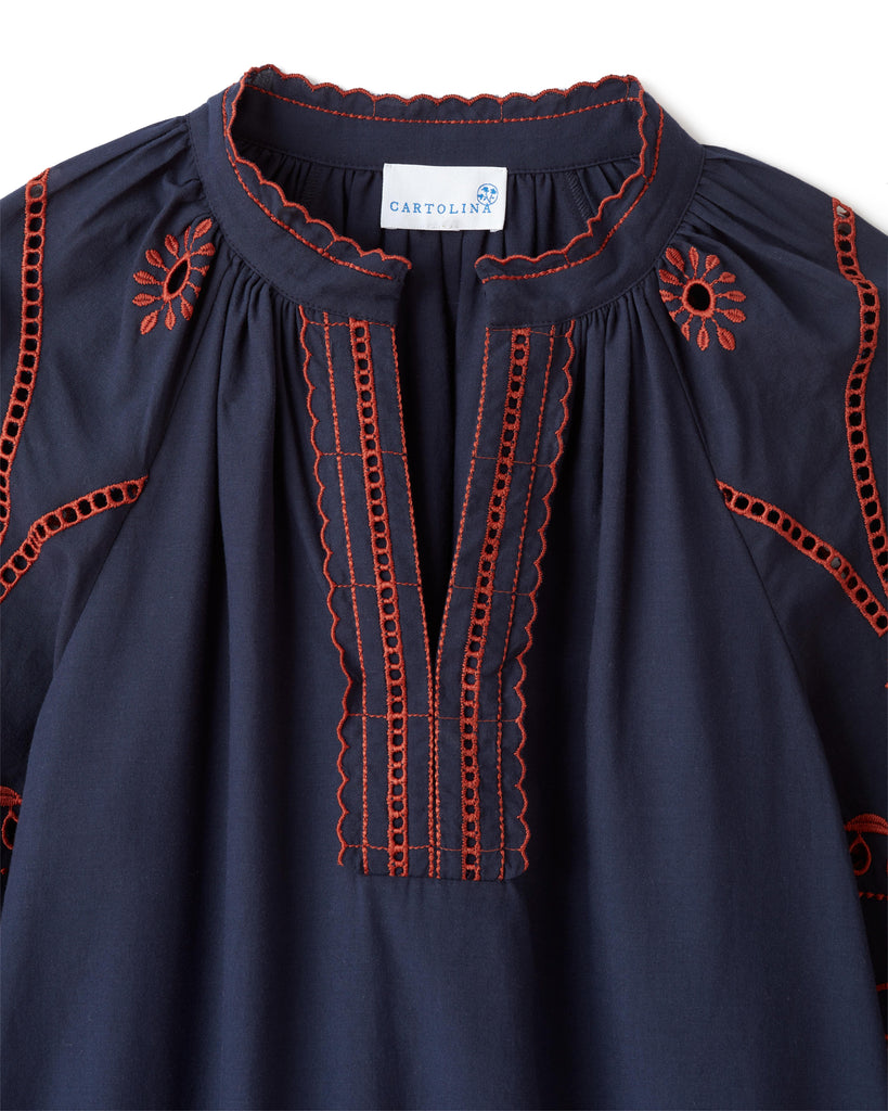 • Raglan sleeve blouse in cotton-blend voile with contrast embroidery