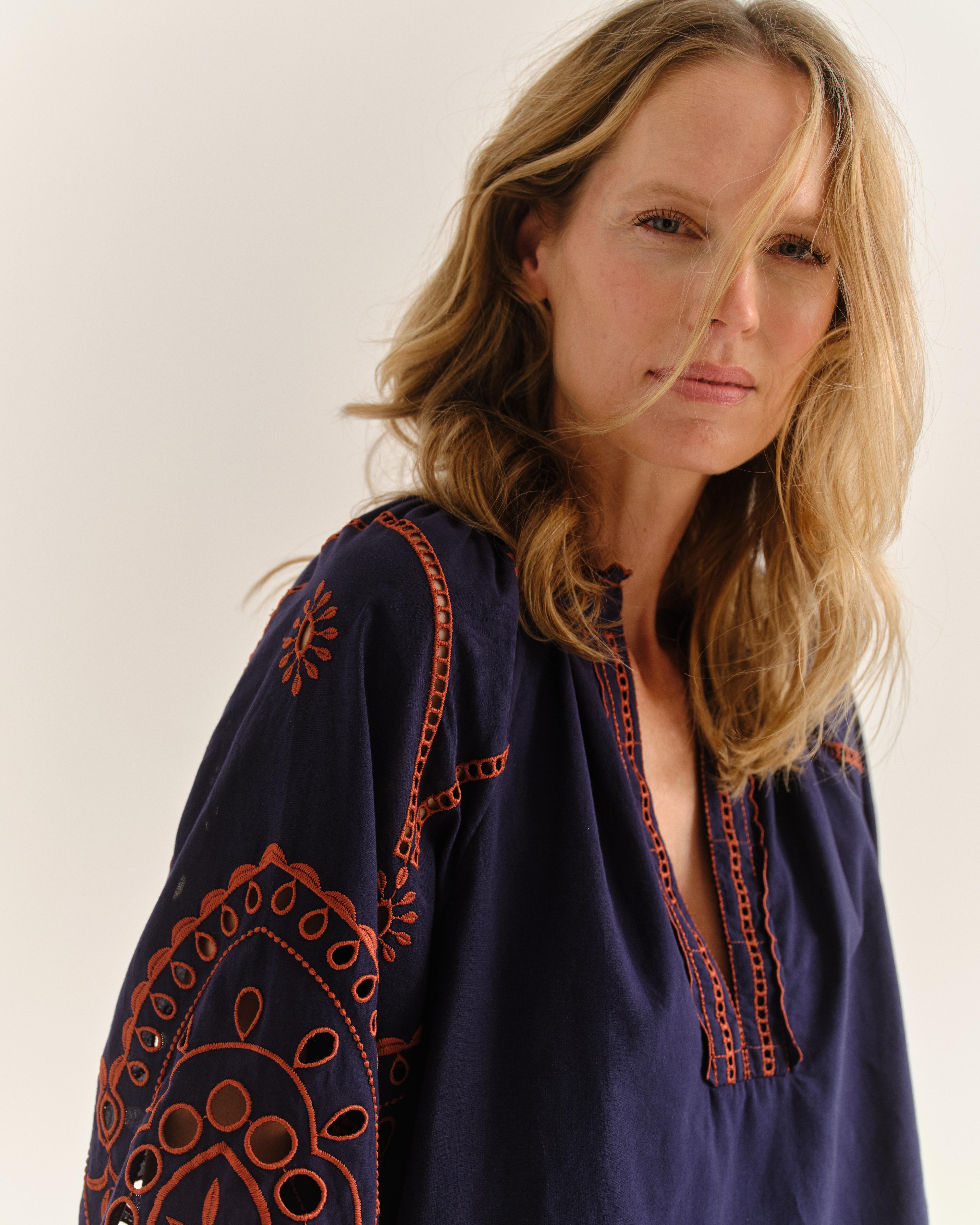 An embroidered blouse that balances delicacy with confidence, this style is full of detail, from scalloped trims to softly gathered sleeves. Wear it to bring subtle romance to both denim and skirts.
