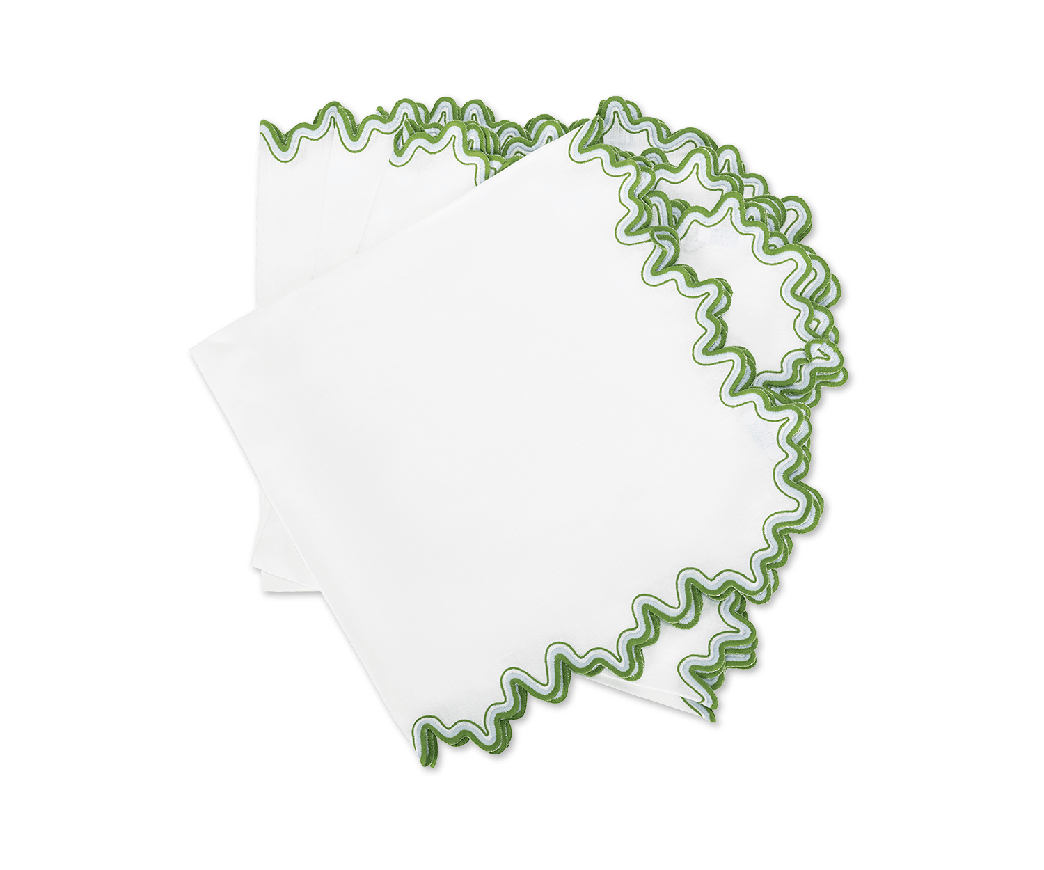 This meticulously embroidered tabletop style features a two-tone border on luxurious linen. It adds a whimsical feel to any dining space.