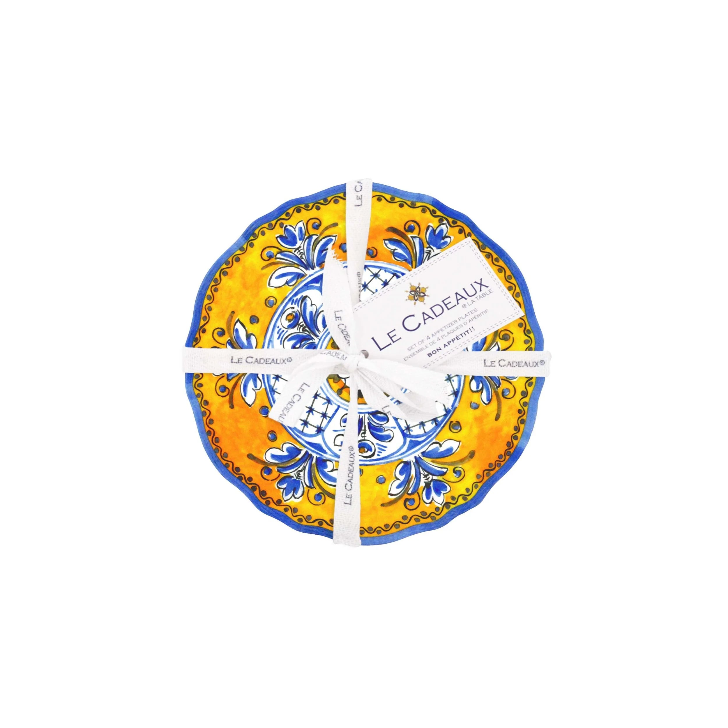 Perfect for entertaining and small bites the Benidorm set of 4 appetizer plates will be the life of the party! Already ribbon tied and tagged for effortless gift giving. BPA Free 100% melamine, shatter-resistant and dishwasher safe, top and bottom rack, as with all melamine, not recommended for microwave. Product includes one Set of 4 Appetizer Plates that have a diameter of 6.5".