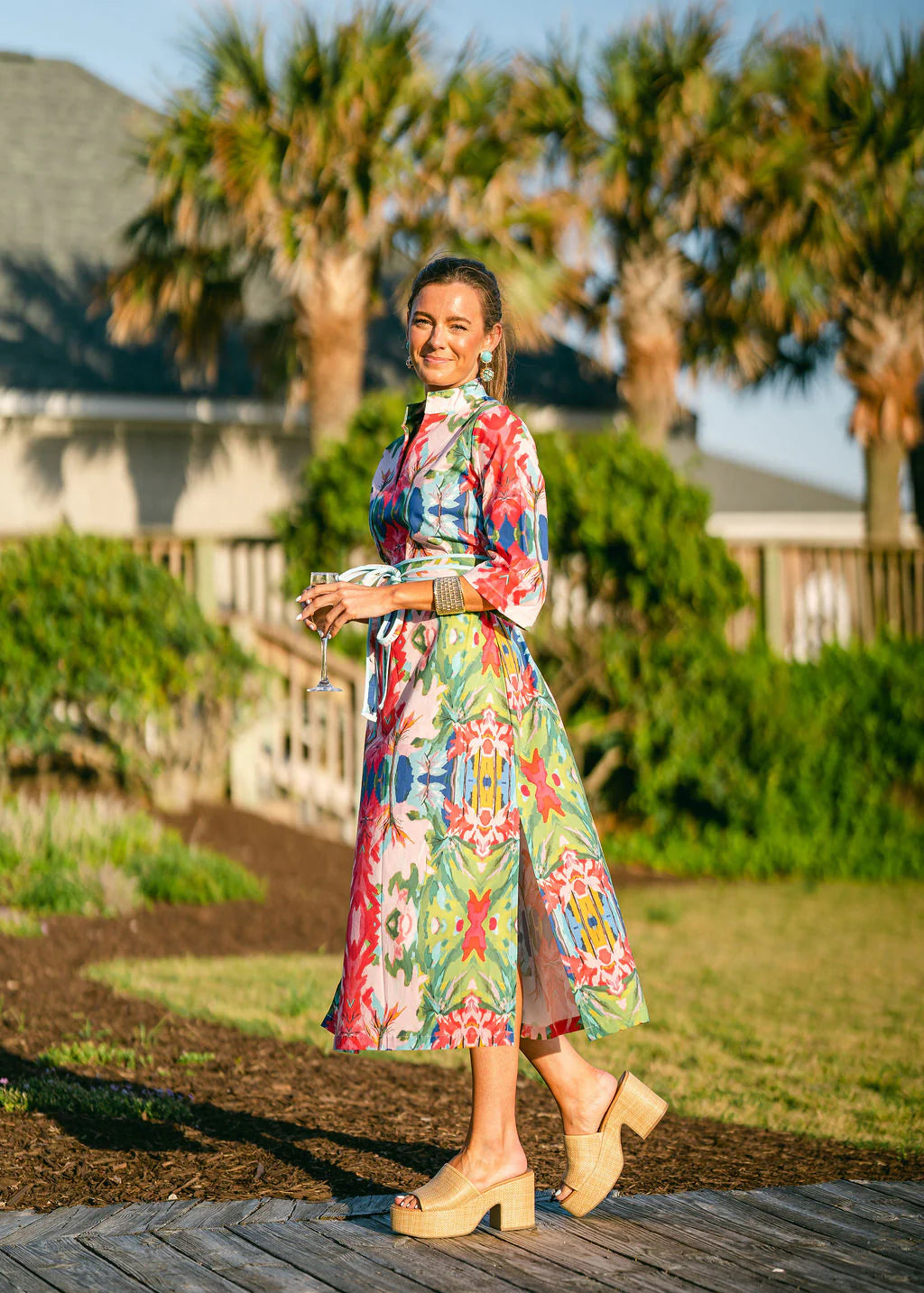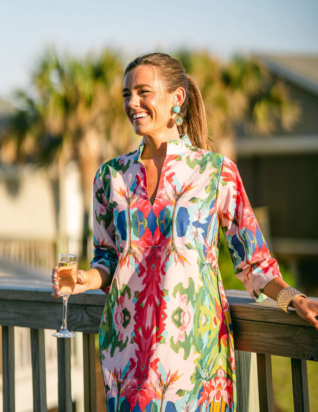 This is a classic tunic cut caftan in signature Mama Chelle © print fabric. This print is an easy and fun combo of muted and grounded tones polished with cheerful pinks and greens.