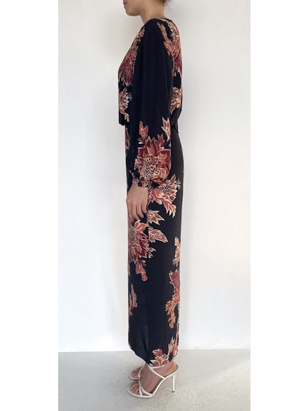 This ankle-length dress features soft black viscose heavy crepe fabric, offering both comfort and structure. Its elegant blouson sleeves add a touch of sophistication, making it perfect for both daytime and evening wear. The flowing silhouette ensures ease of movement while maintaining a polished look.