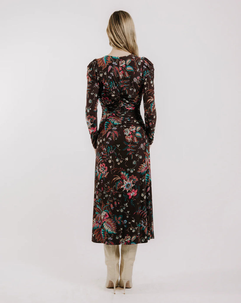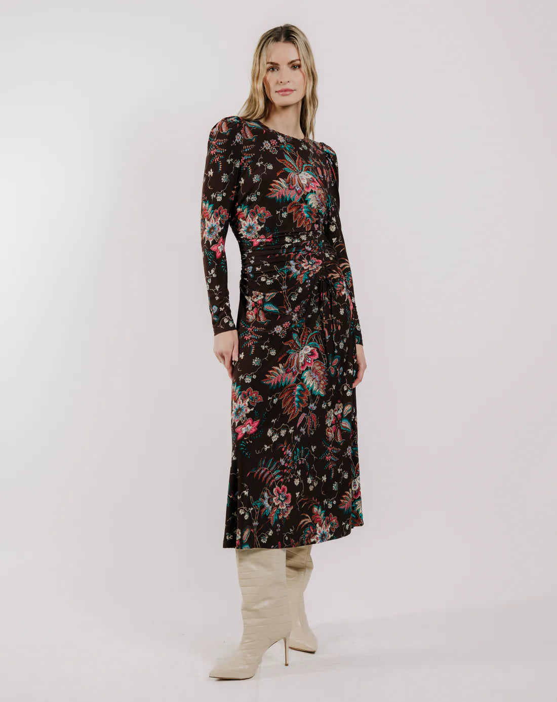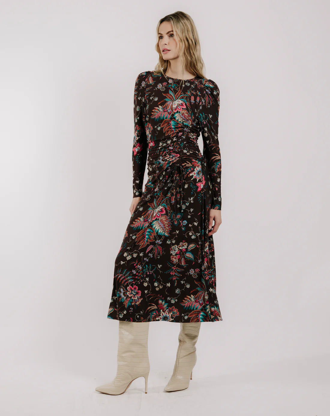 • The Astrid Maxi Dress in Charlotte Floral Print in a signature buttery soft knit jersey has a ruched waist that is adjustable with a tie for a flattering fit with soft draping, offering an easy yet elegant silhouette.