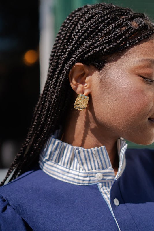 Bold, sculptural, and effortlessly chic — the Avery Bamboo Hoop Earring reimagines a classic with an organic twist. Crafted with 18k gold plating, these hoops feature a bamboo-inspired texture that adds natural elegance and contemporary edge. Lightweight and eye-catching, they’re the perfect statement piece for both day and night. Style them solo or pair with your favorite gold layers for a radiant look.