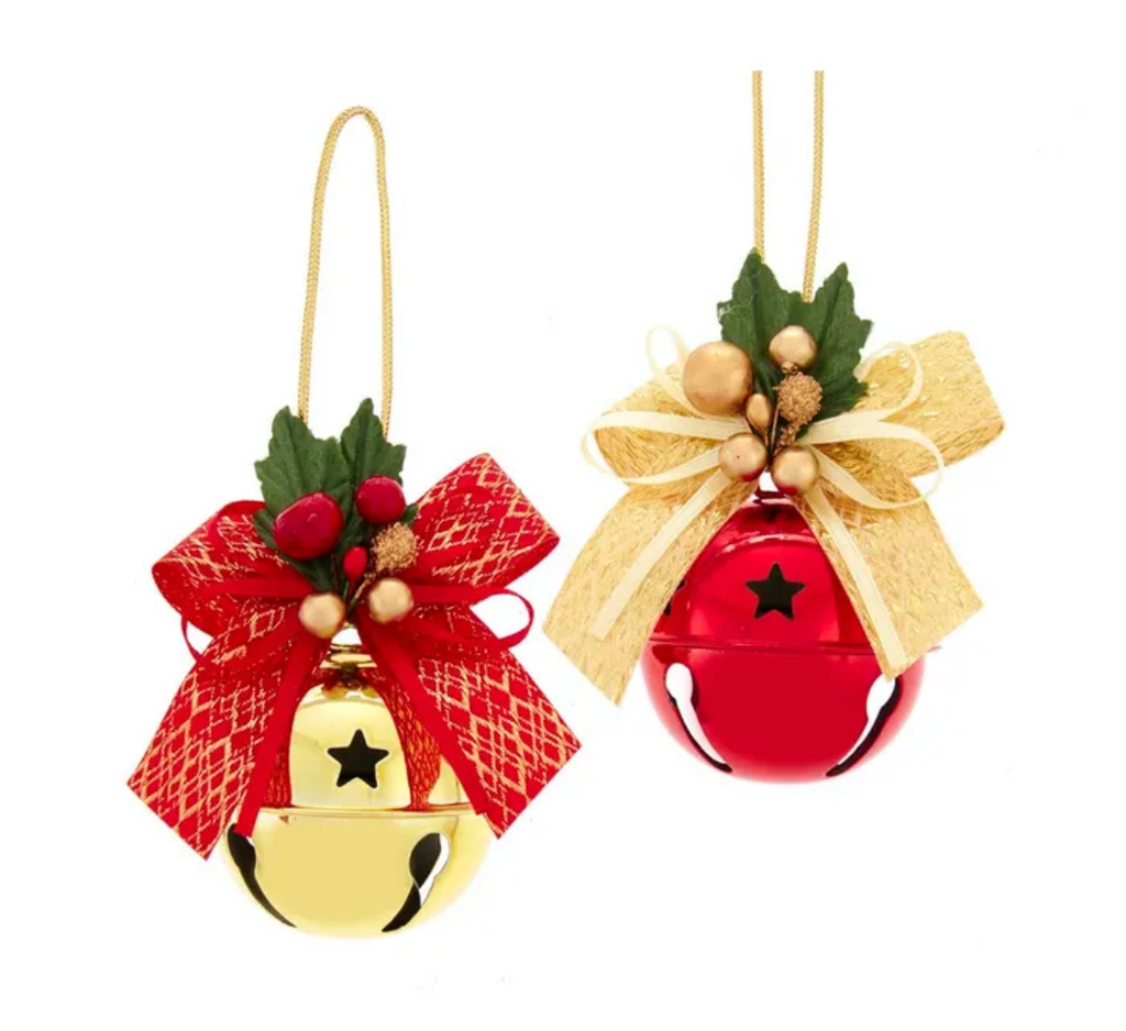 These 60-millimeter red and gold jingle bell ornaments from Kurt Adler are a fun and festive addition to your holiday décor or Christmas tree. Included in this assortment are a gold bell with star shaped cut-outs with a red and gold ribbon bow and green leaves and red berries and a red bell with star shaped cut-outs with a gold ribbon bow, green leaves and gold berries.
