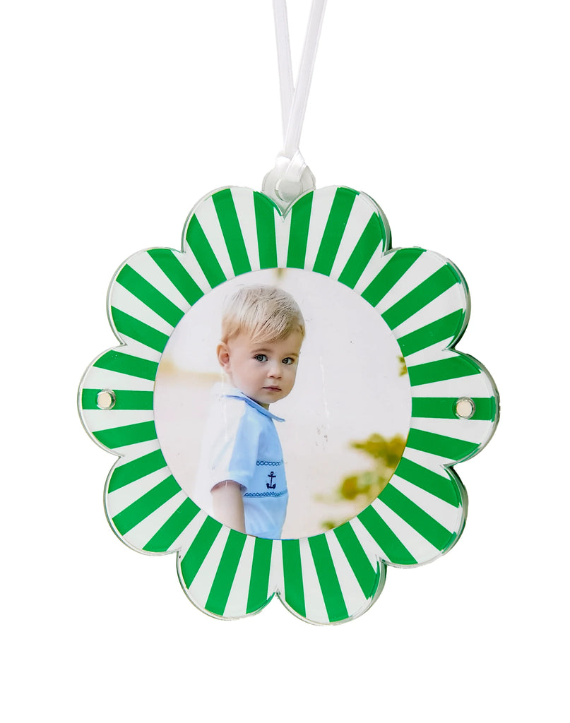 Brighten up your holidays with the double-sided daisy photo ornament. Playful yet chic, this scallop design keeps your favorite photos at the heart of your holiday décor.