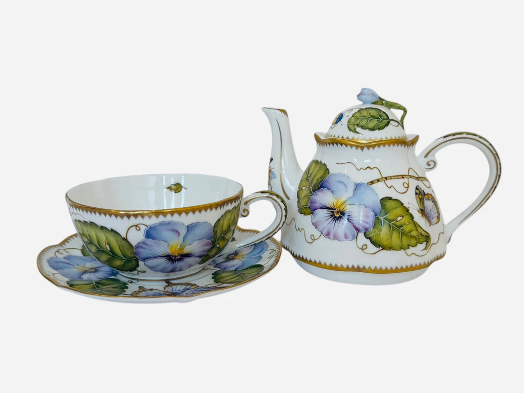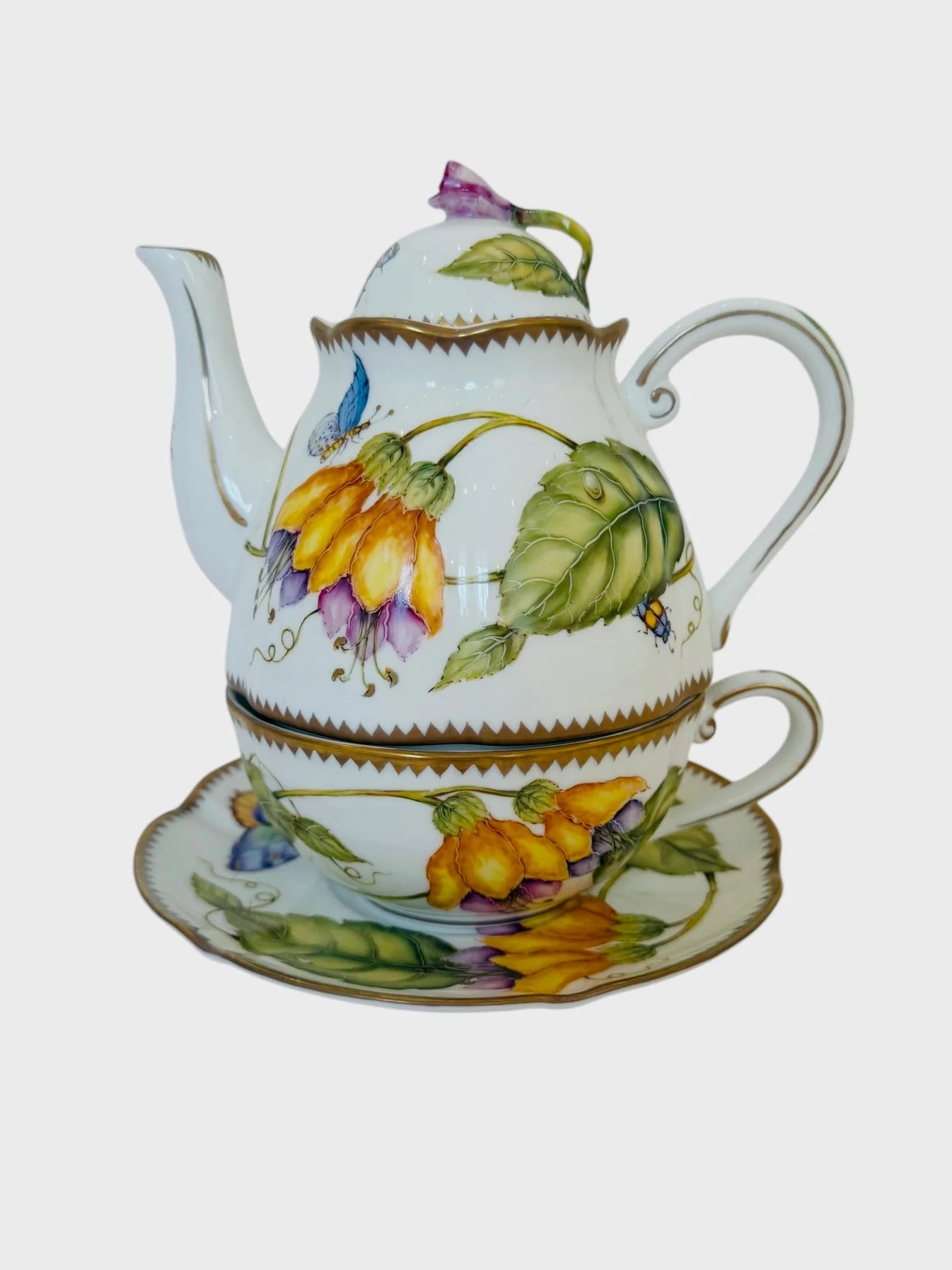 This hand-painted tea set features a charming yellow flower design on a teapot, cup, and saucer. Each piece showcases delicate craftsmanship, adding a touch of elegance to your tea experience. Perfect for serving your favorite teas with style and a warm, inviting feel.
