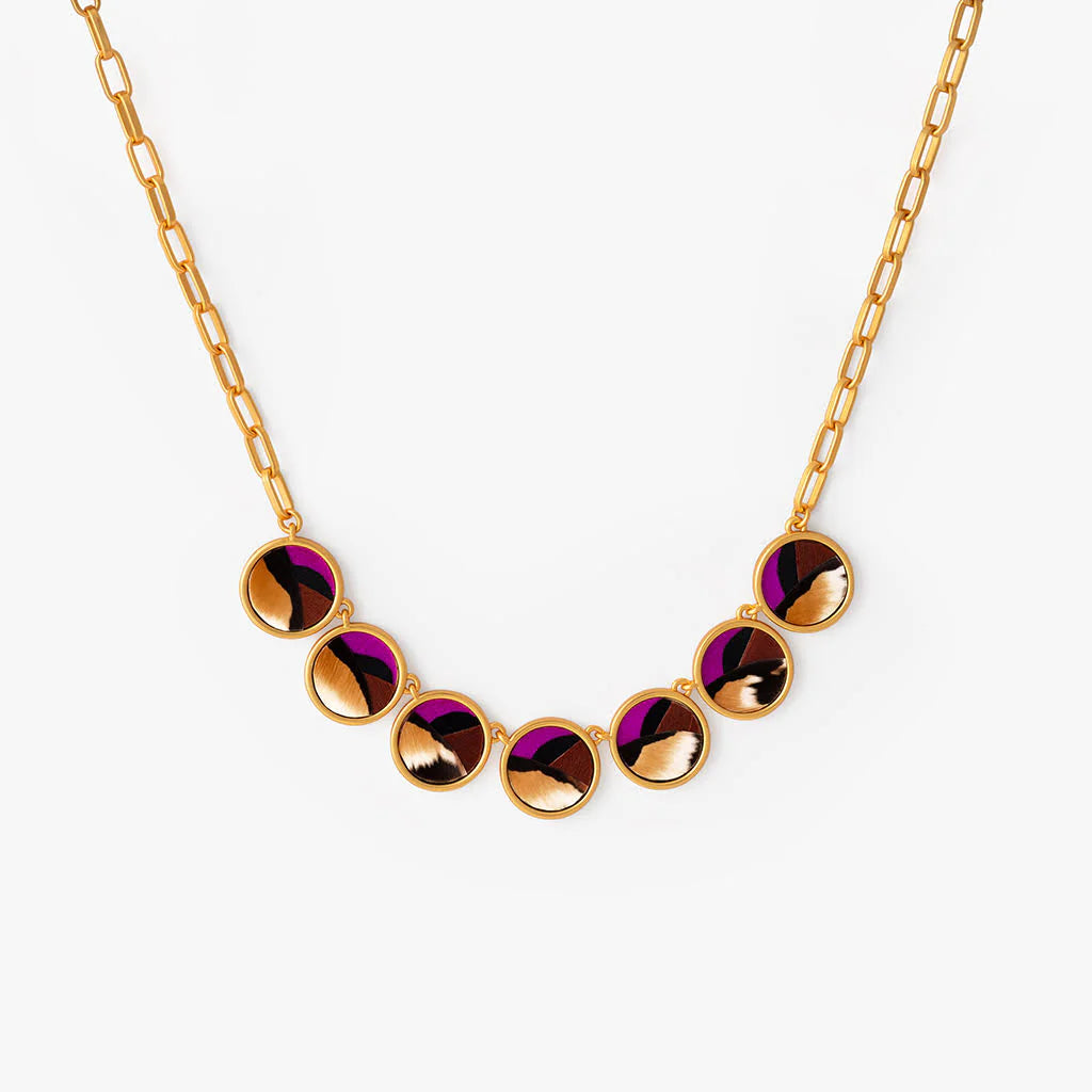 Inspired by the shifting tones of a warm evening sky, the Ella Necklace features a layered mix of goose, pheasant, and turkey feathers set within a series of sleek bezels. Neutral patterning from pheasant and turkey provides an earthy foundation, while a burst of fuchsia goose feathers brings an unexpected pop of color - echoing the vibrant glow of sunset. With its elongated silhouette and soft movement, Ella offers a modern, natural elegance that makes it ideal for layering or wearing as a standalone centerpiece.