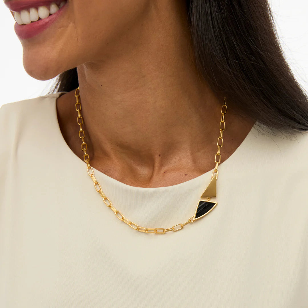 Sleek, textural, and effortlessly versatile, the Evelyn Necklace features fine black rooster hackle feathers inlaid within a modern asymmetrical triangle pendant. The feathers' natural sheen and soft taper create a subtle, dimensional texture that catches the light with understated elegance. Set in 18K gold plating, Evelyn balances edge and refinement - perfect worn solo for a clean, minimalist look or layered with other pieces for added depth and contrast.