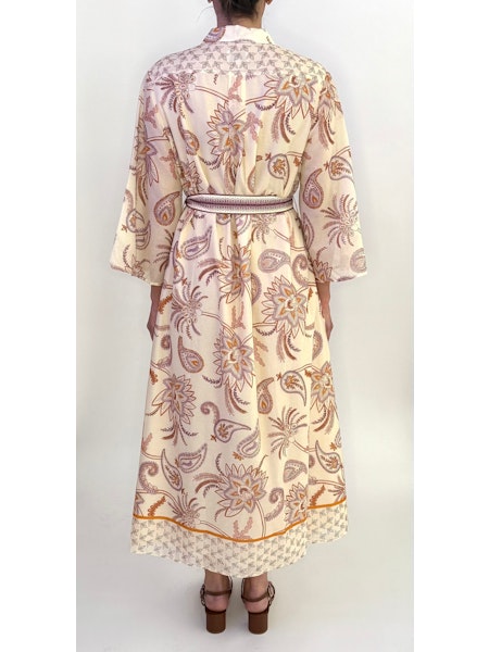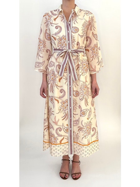 This paisley printed maxi dress features a classic button-down front and a flattering tie waist, creating a comfortable yet stylish silhouette. Perfect for casual outings or dressier occasions, its flowing fabric and timeless pattern offer effortless elegance and versatility.