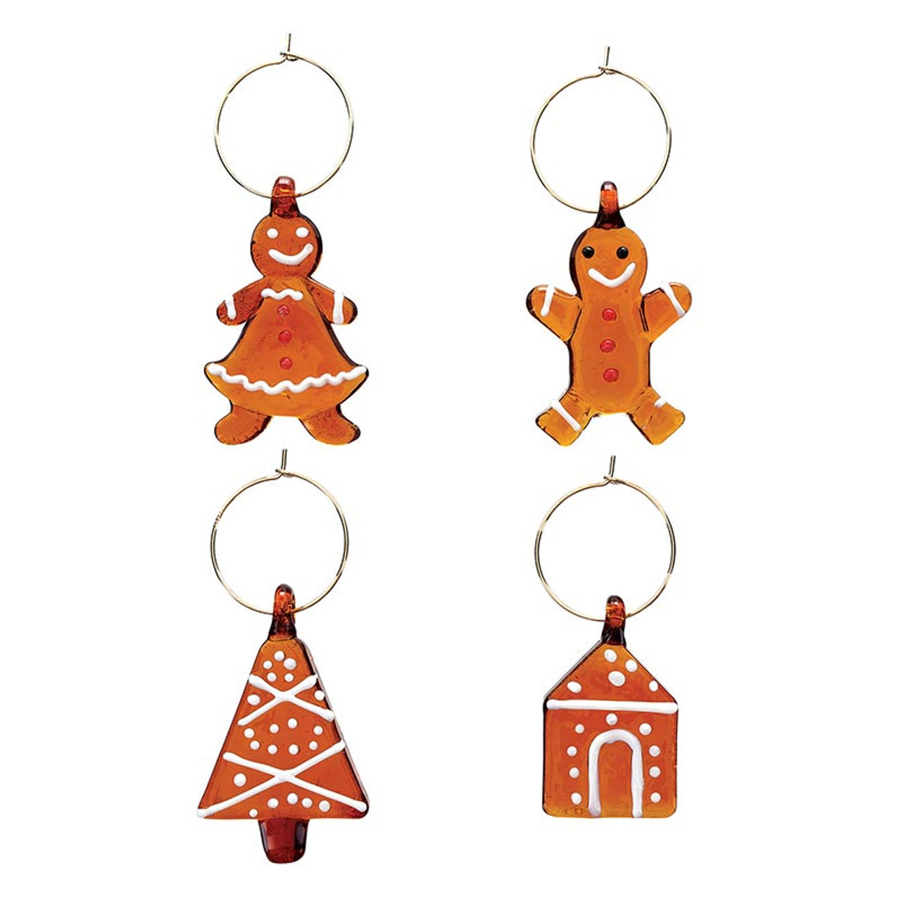 Celebrate the season with the Gingerbread Icon Wine Charms! This handcrafted set of four-featuring a gingerbread boy, girl, tree, and house-is made from borosilicate glass with a hand-painted finish. A festive and functional touch for holiday entertaining!