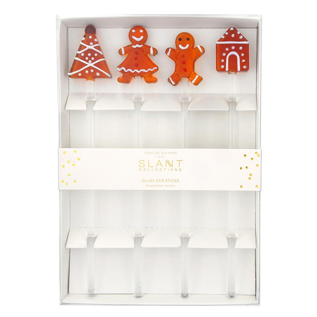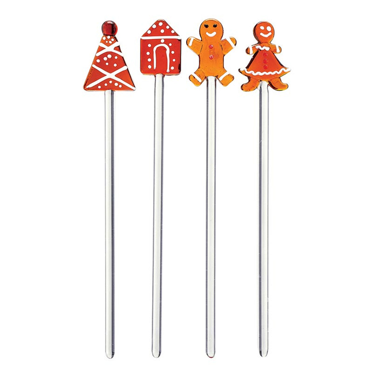 Stir up festive fun with the Gingerbread Icon Glass Stir Sticks, featuring a delightful mix of gingerbread boy, girl, house, and tree designs.