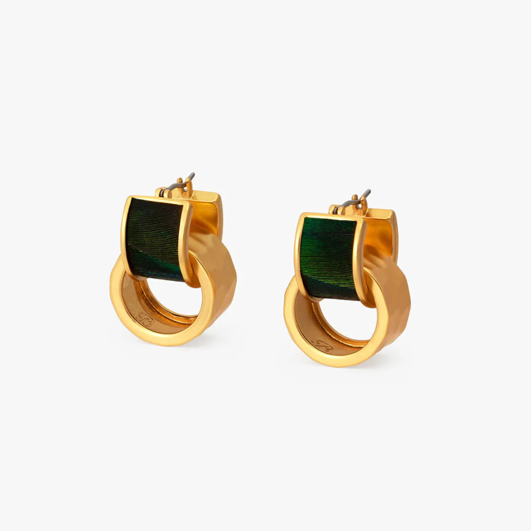 Rooted in nature and finished with a touch of iridescent allure, the Ivy Huggie Hoop features deep green peacock feathers that evoke the richness of the forest canopy. With their subtle shimmer and layered texture, the feathers catch the light just enough to create movement and depth. Delicate yet distinctive, Ivy brings a grounded elegance to your everyday look - effortless on its own or stacked with your favorite studs.