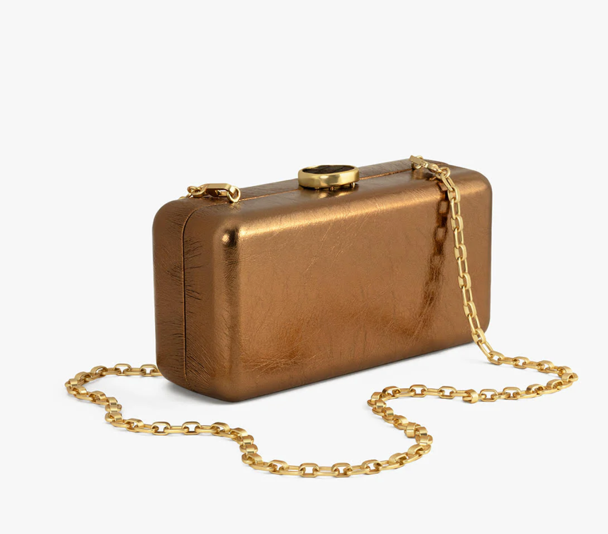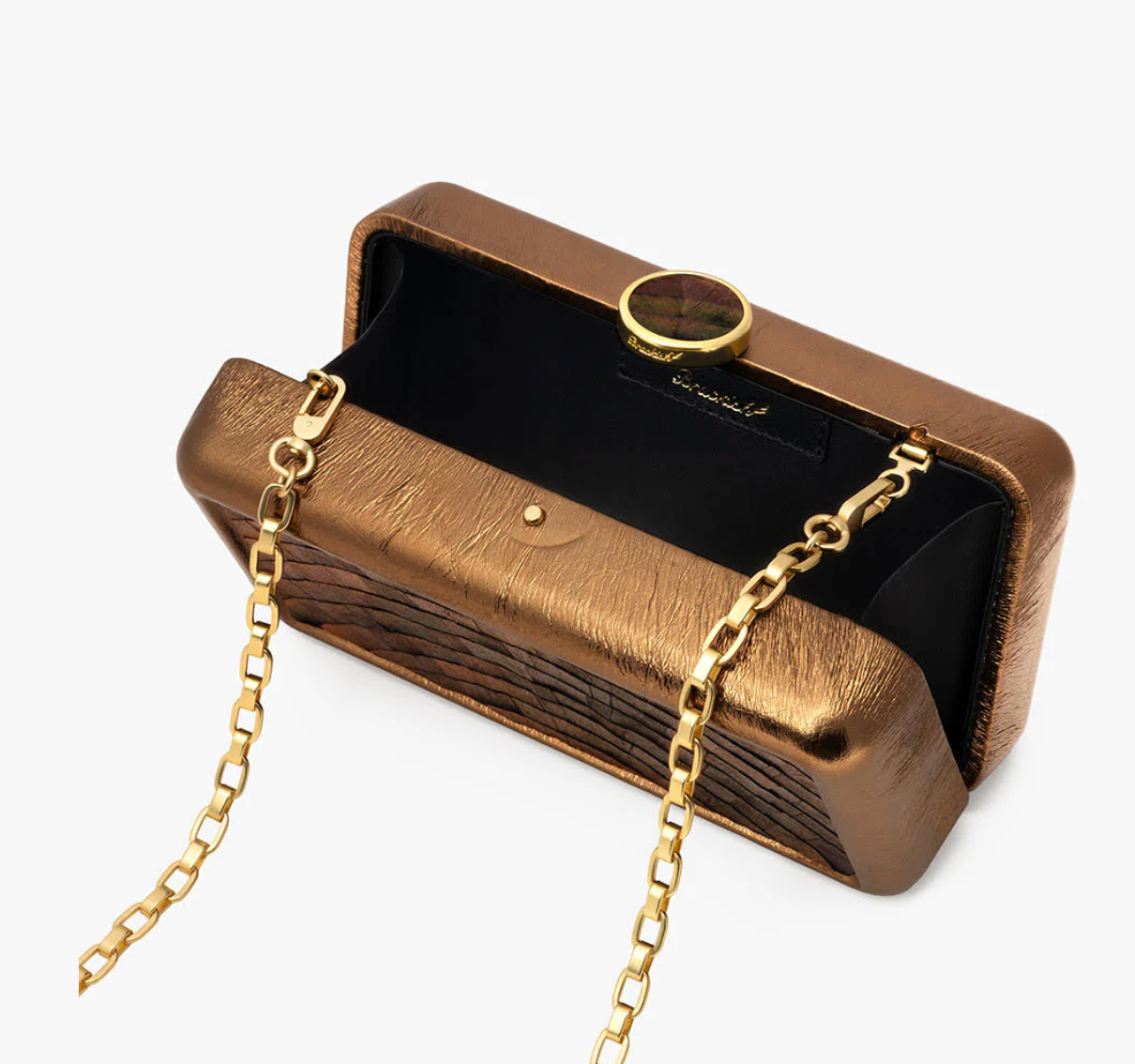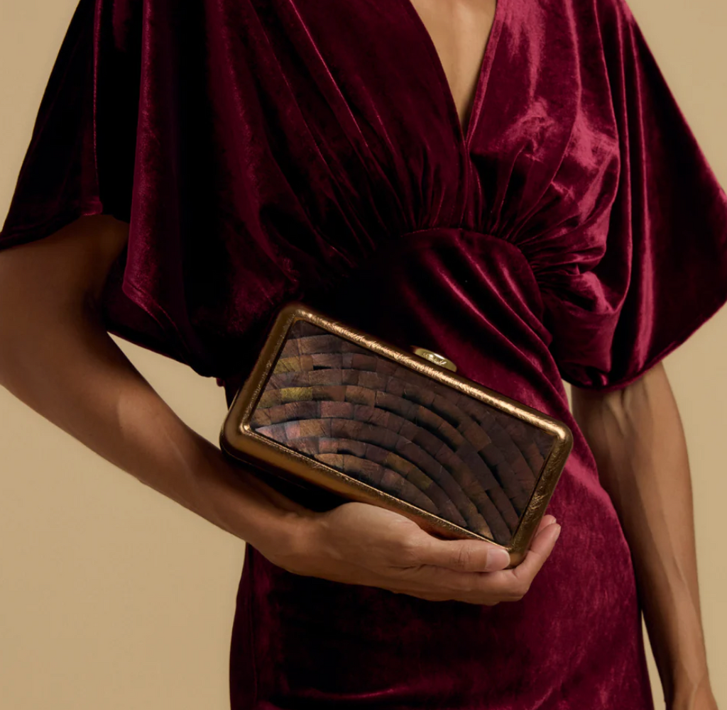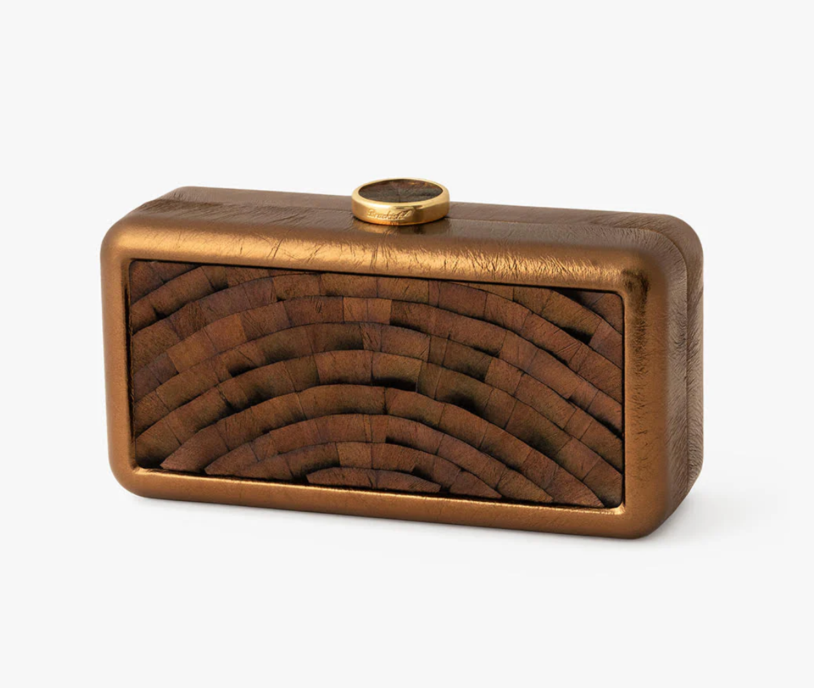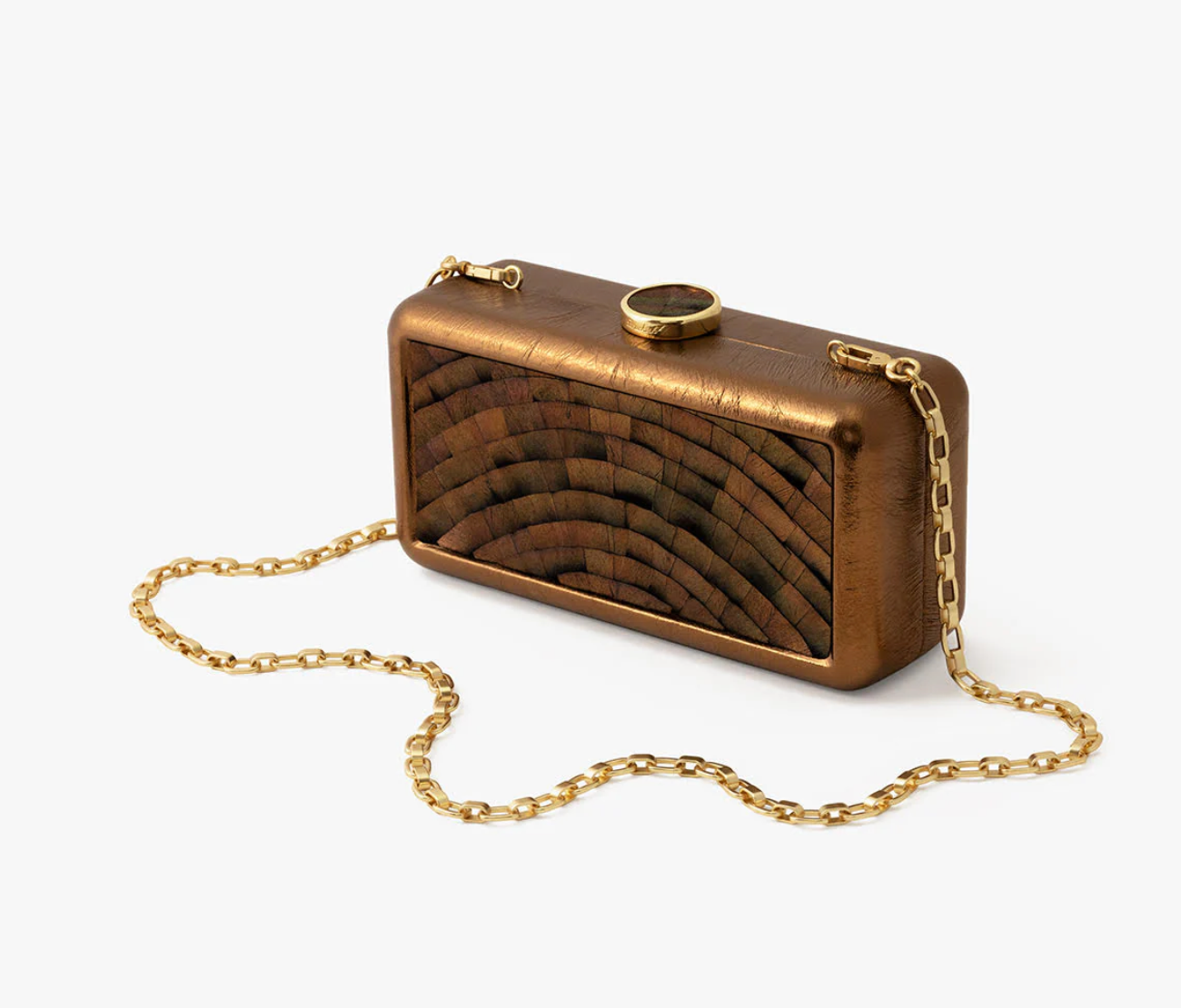 Classic elegance meets nature’s brilliance in the Le Marais Feather Panel Clutch. This refined accessory features a structured silhouette accented by a hand-applied panel of copper turkey feathers, known for their rich, iridescent tones and organic patterning. The warm copper hues shimmer with natural depth, offering a radiant play of color that shifts with the light - from burnished golds to deep auburns. Subtle yet statement-making, Le Marais adds texture, sophistication, and Brackish’s signature craftsmanship to any look.