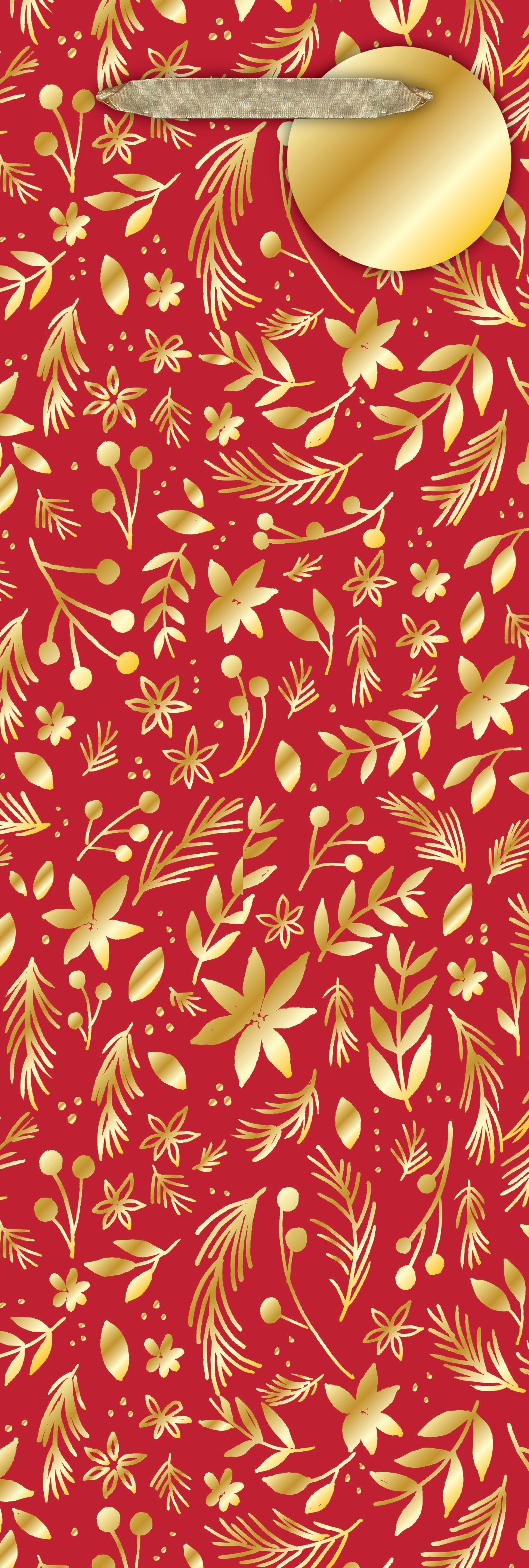 Add an elegant touch to your gift with this luxurious bottle tote bag, featuring an intricate gold foil floral design that shines against a rich red background. The metallic shiny gold ribbon handle and matching gold foil hang tag provide the perfect finishing details, making this tote ideal for gifting a bottle of wine or champagne for any special occasion. Elegant and festive, it's the perfect way to impress!