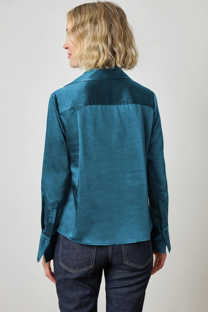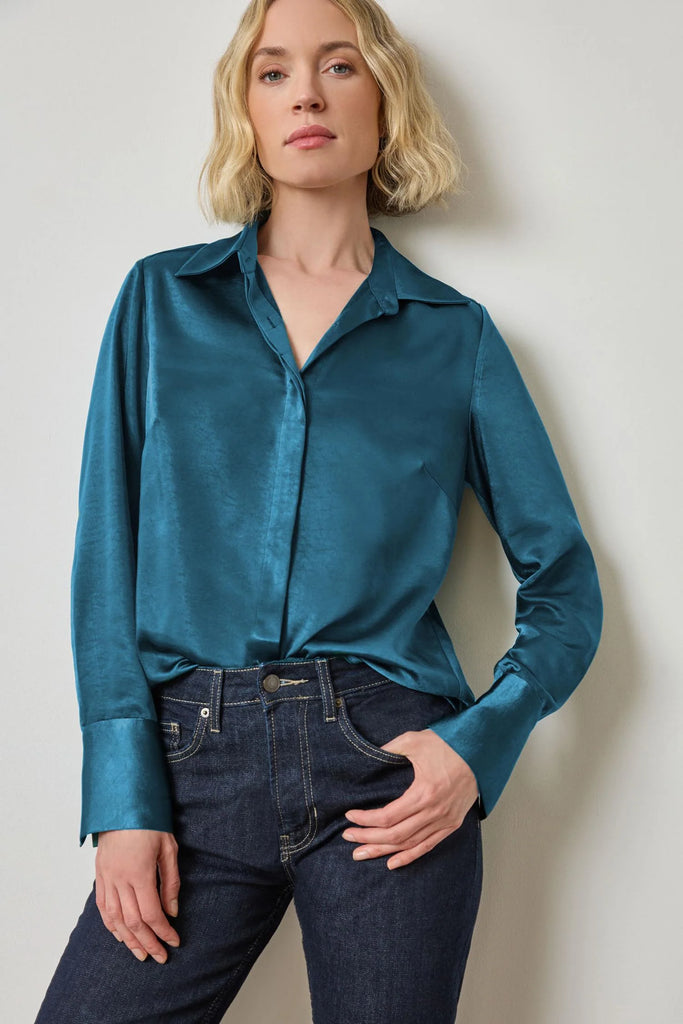 The Satin Button Down offers the ease of a button-down shirt in a luxe satin fabric. Designed with a hidden button placket for a clean, refined look, this shirt features elegant French cuffs that add a sophisticated touch. The perfect blend of polish and versatility, this piece transitions effortlessly from day to evening.