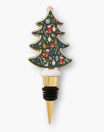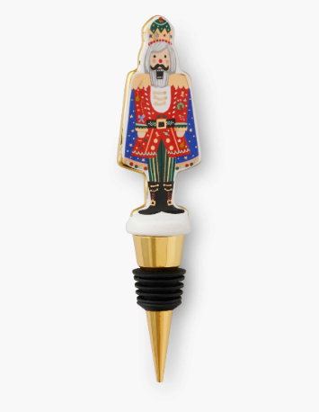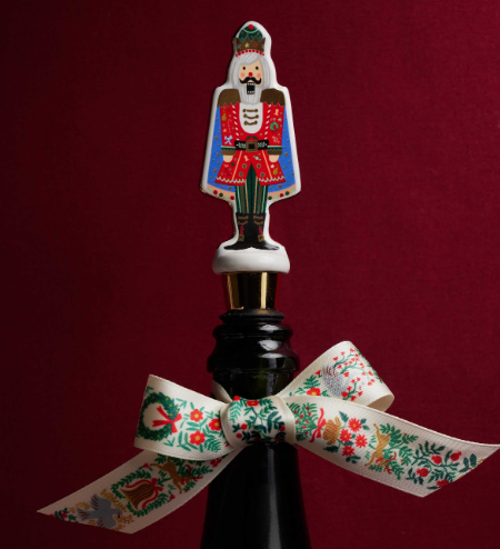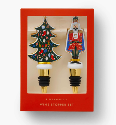 A pretty pair of porcelain wine stoppers, in the shape of a nutcracker and a Christmas tree with illustrated artwork and gold foil accents.