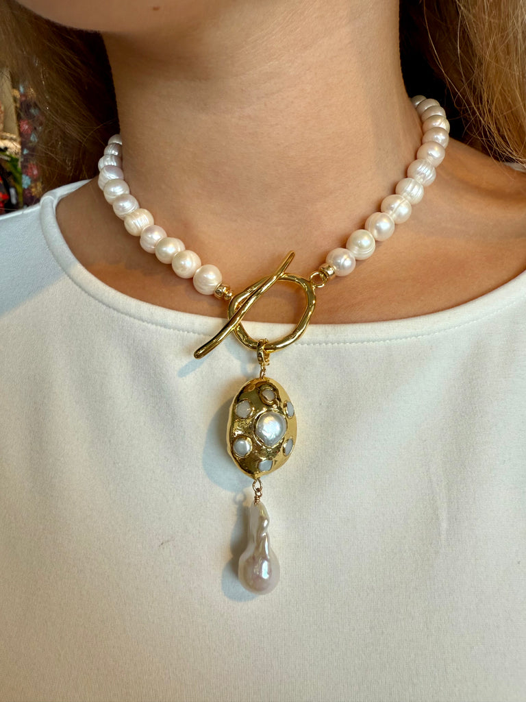 The Saint Tropez Necklace features elegant pearls complemented by a delicate pearl pendant drop, creating a timeless and sophisticated look. Perfect for both everyday wear and special occasions, this necklace adds a graceful touch to any outfit. Its classic design enhances your style with subtle elegance.