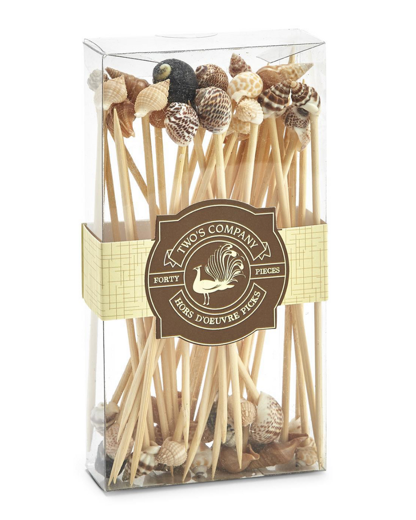 This set of 40 Sea Fare wooden food picks are perfect for serving appetizers or cocktail garnishes. Each pick features a charming seashell accent that is applied by hand. The picks measure 6" long and the set is packed in a paper wrapped container, making them a great gift!
