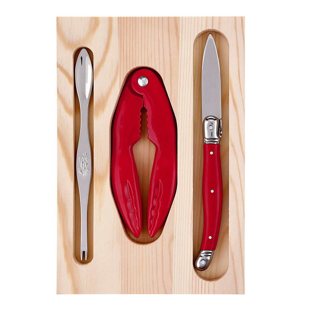 Tray keeps tools organized and ready for the table. Rustic wood tray and polished tools create an elegant, customized seafood display.