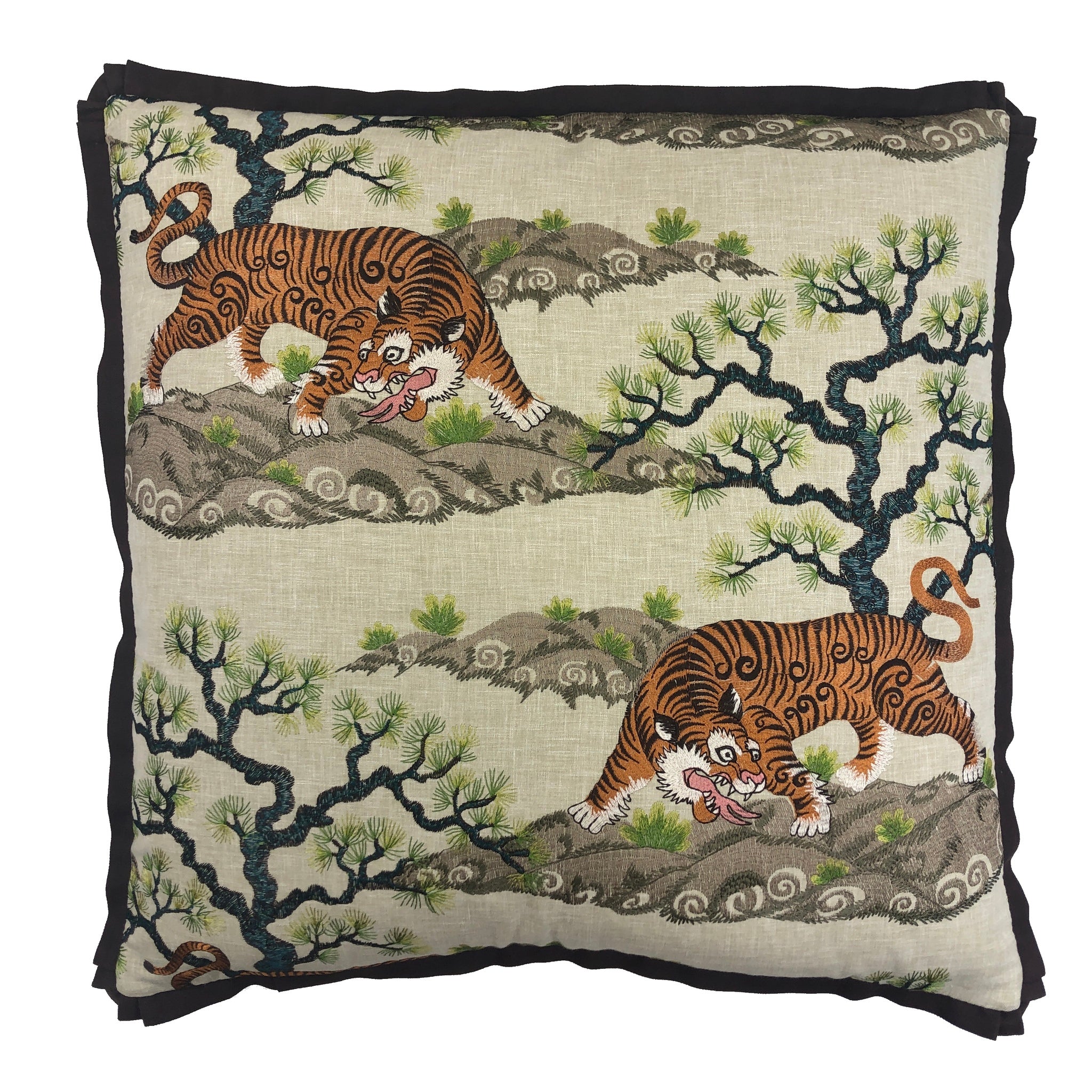 The Chonburi Oasis Pillow brings sophisticated style to any room with its beautifully embroidered design and cupcake flange detailing. Crafted from neutral linen with a rich brown flange, this pillow combines elegance with comfort. Features a convenient zipper closure for easy maintenance and is filled with premium feather down for a luxuriously soft feel. Dry clean only to preserve its quality and appearance.