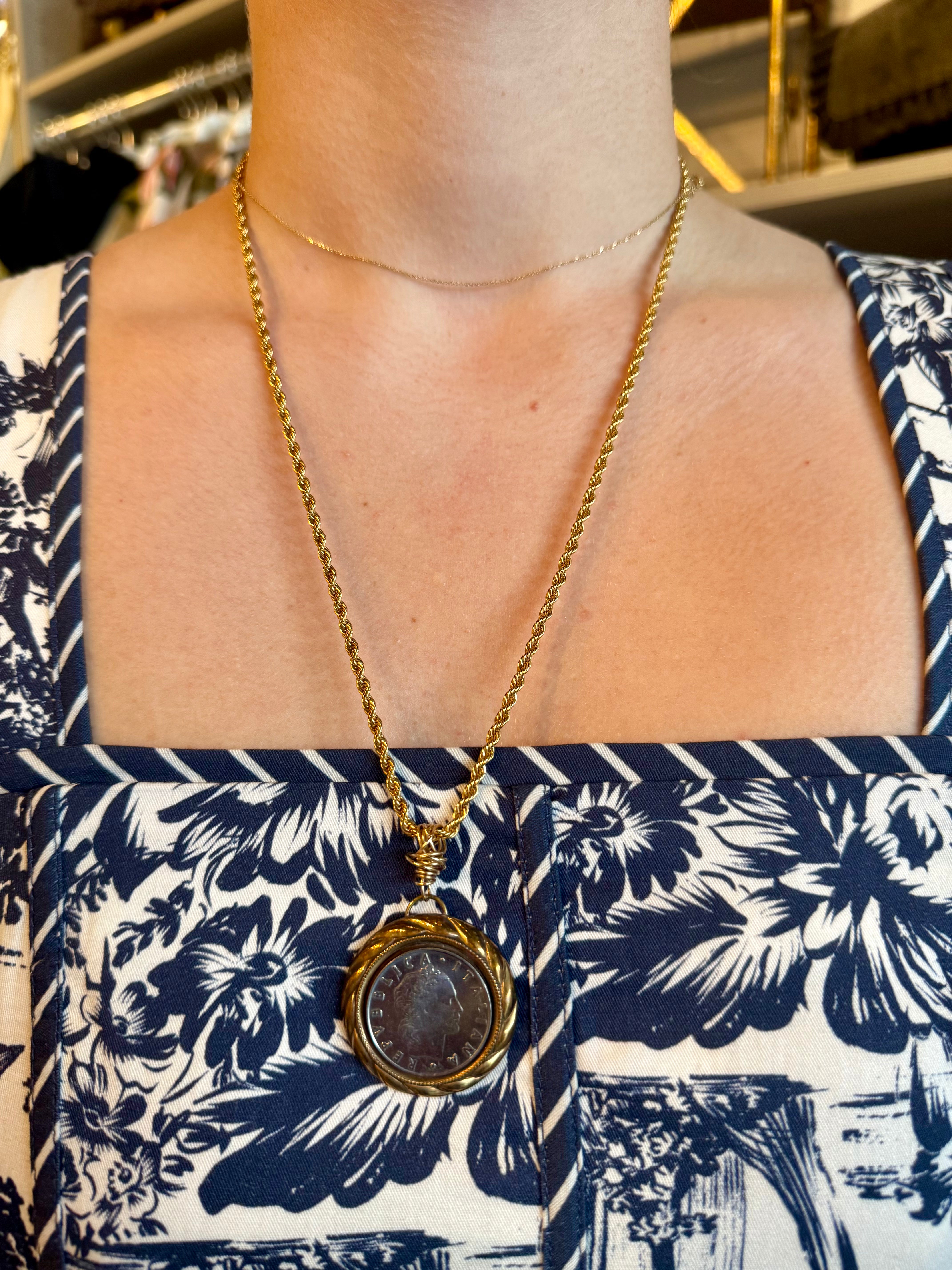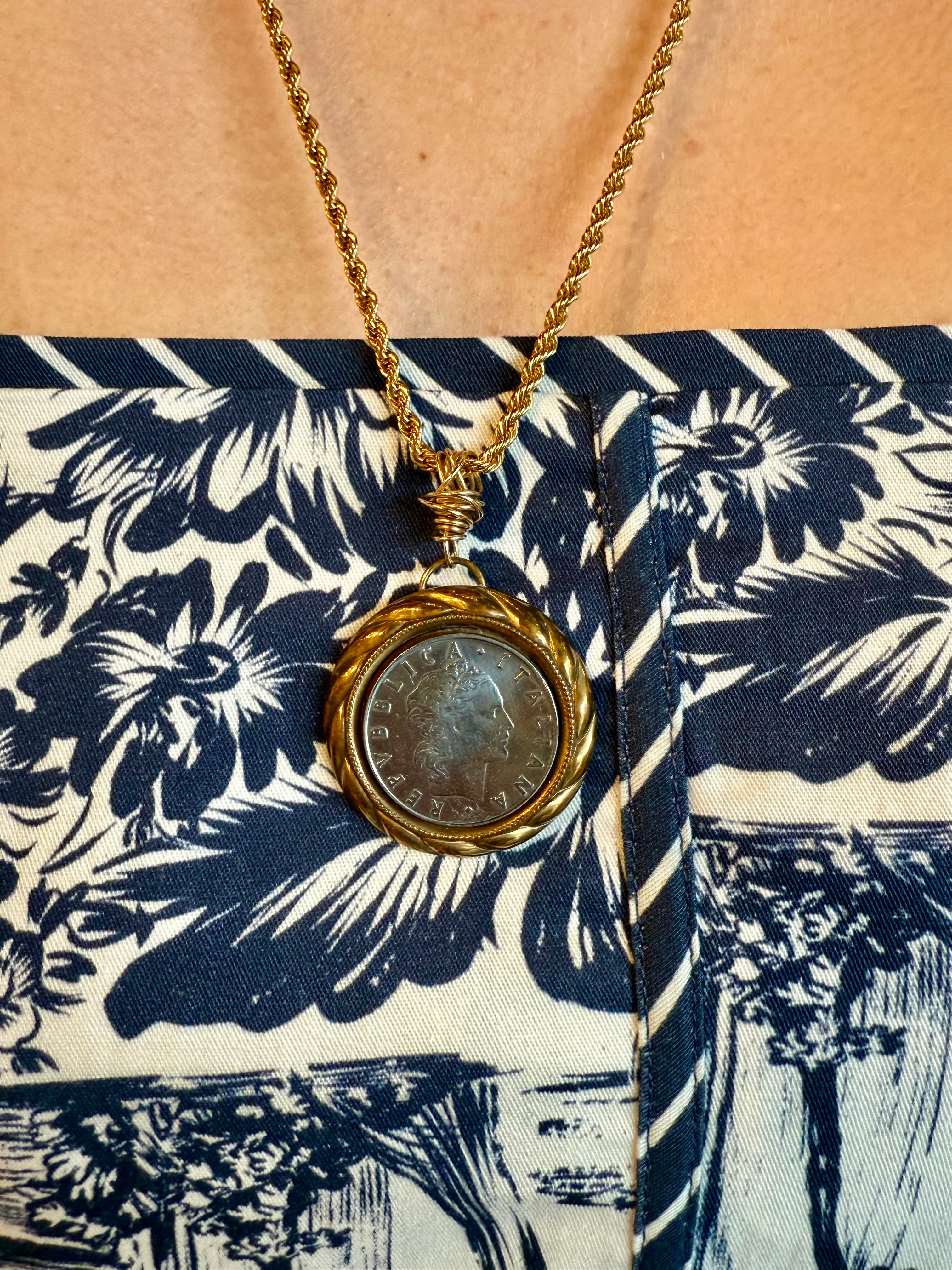 Authentic coin suspended in a brass setting, paired with an 18k gold-plated sterling silver chain and delicate gold-filled wire details. This timeless piece combines vintage charm with modern craftsmanship, creating a sophisticated accessory that works beautifully layered or worn alone. Perfect for adding character to any wardrobe.