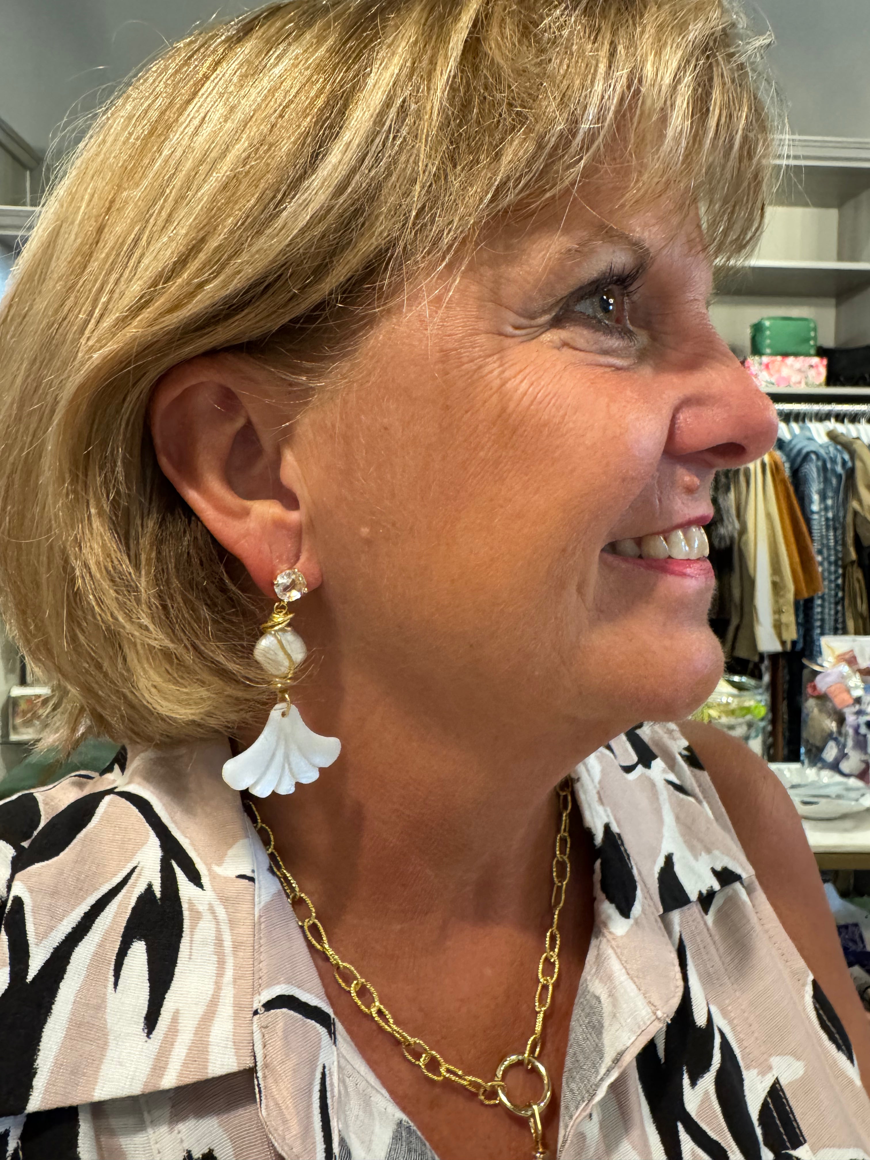 Delicate and elegant, these Mother of Pearl Fan Earrings add a touch of natural shimmer to any ensemble. Crafted with lustrous mother of pearl, their fan-shaped design catches the light beautifully, offering subtle sophistication suitable for both everyday wear and special occasions. Lightweight and comfortable, they enhance your look with effortless charm.
