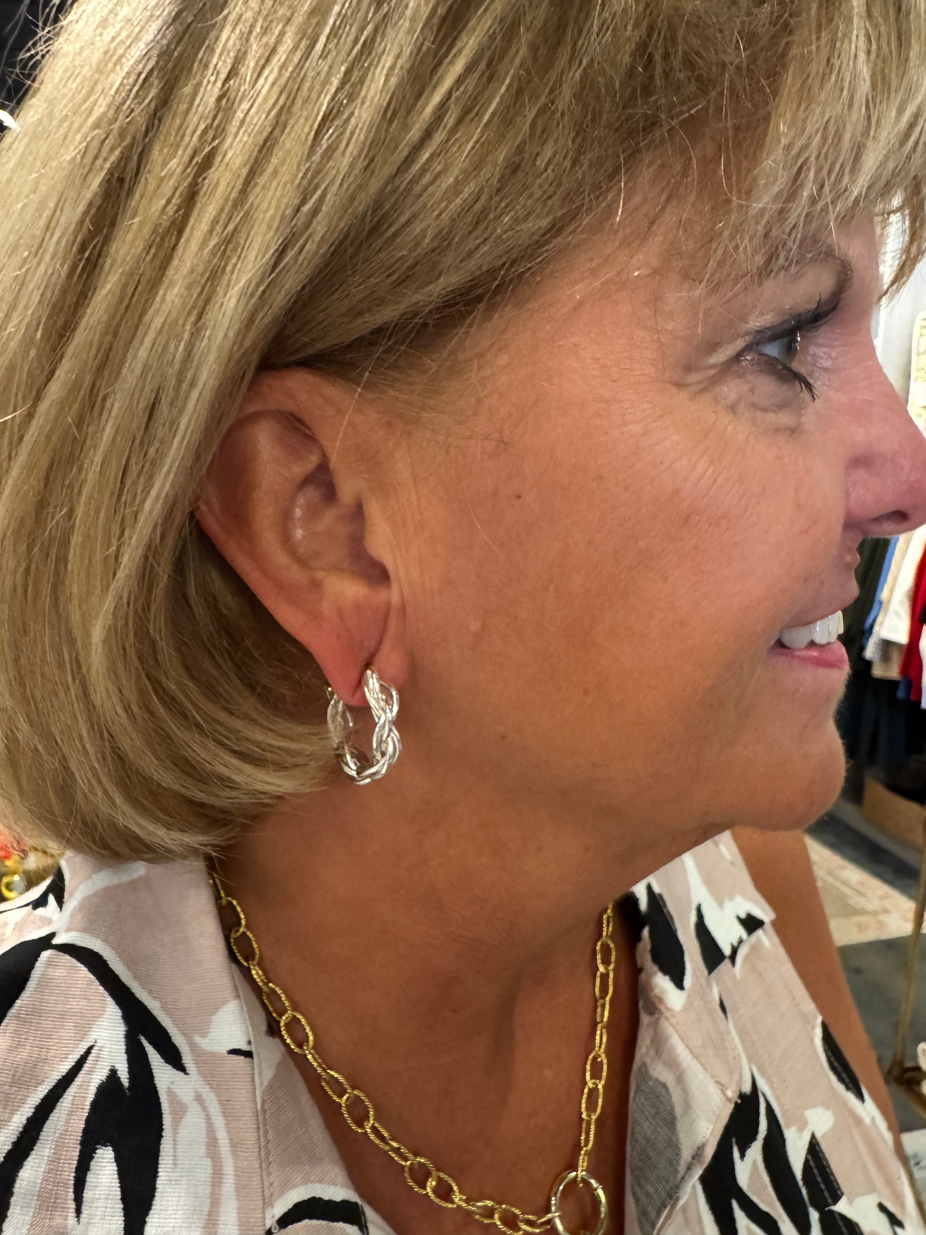 These Silver Twist Hoop Earrings feature a sleek, twisted design that adds a subtle touch of elegance to any outfit. Crafted from durable silver, they offer both style and lasting quality. Perfect for everyday wear or special occasions, these hoops provide a timeless accessory that complements a variety of looks.