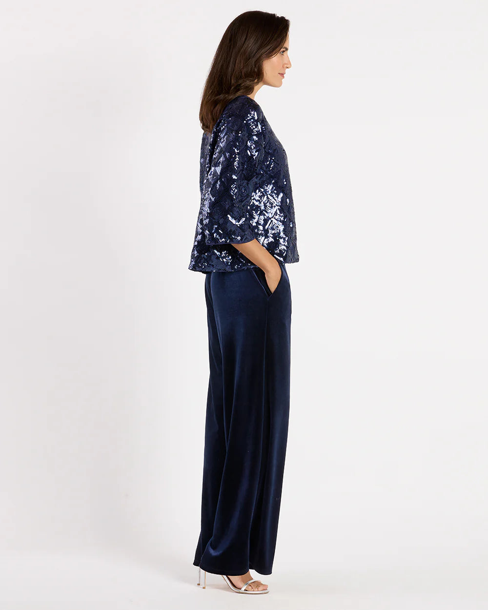 Meet Dora! A chic and effortless pullover top featuring a flattering bateau neckline and 3/4 sleeves. Crafted from elegant sequins, this versatile adds just the right amount of sparkle making it perfect for any occasion. A timeless staple you'll reach for again and again!