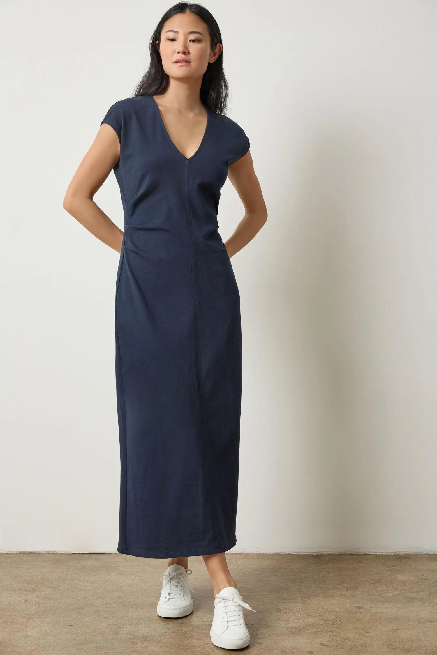 The Side Tuck Maxi Dress in Structured Knit, a slightly heavier-weight compact jersey that holds its shape beautifully, has a straight fit with just the right amount of ease. Side pleats add subtle detail and create a flattering shape, complementing the simple V-neckline. Effortless yet polished, this dress is a refined staple you'll reach for season after season