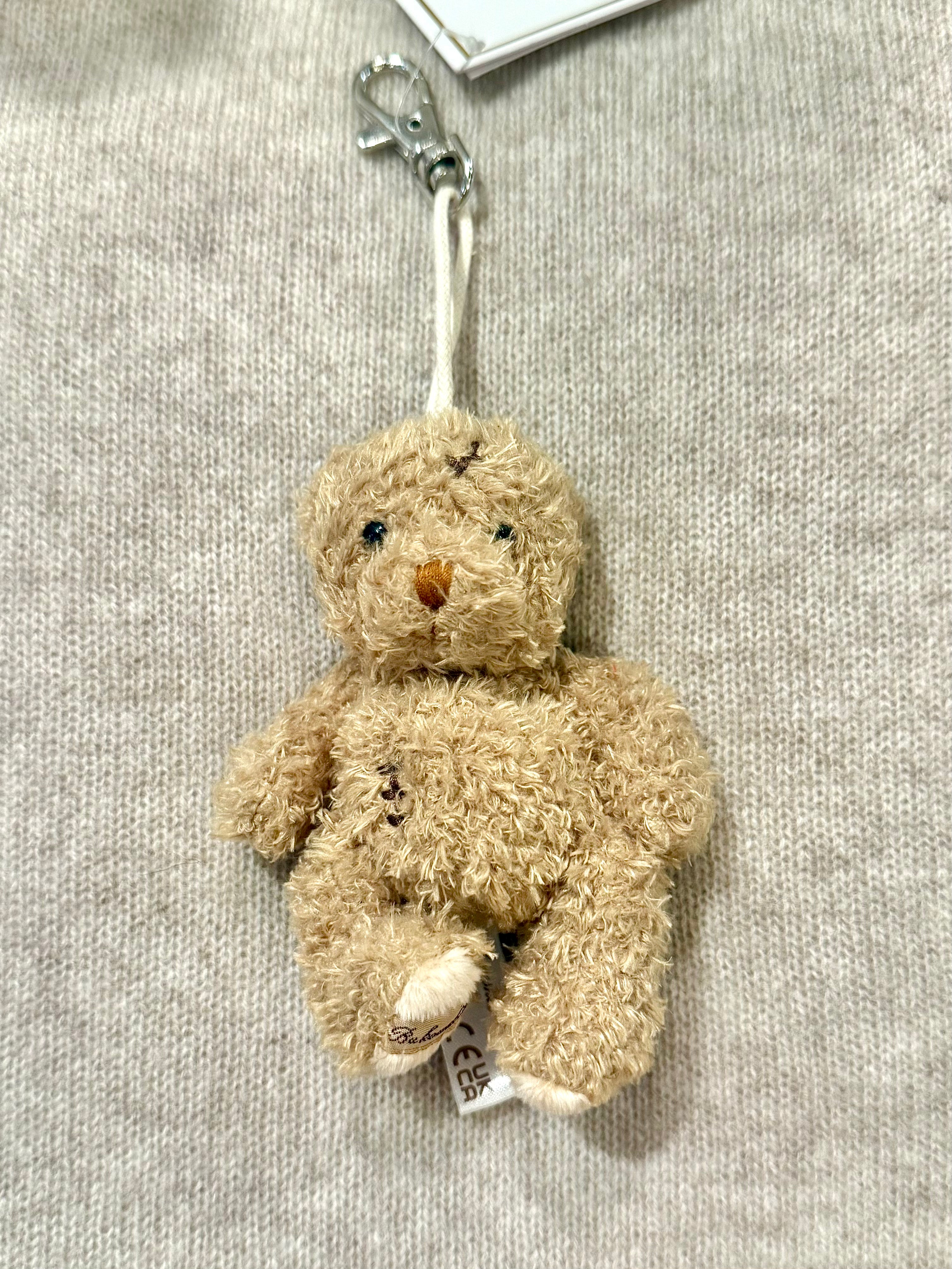 This adorable teddy bear bag charm features a vintage, well-loved look with soft, plush fur, stitched details, and a slightly worn appearance. Attached to a sturdy metal clip with a fabric loop, it's perfect for adding a touch of charm to your bag, keys, or accessories.