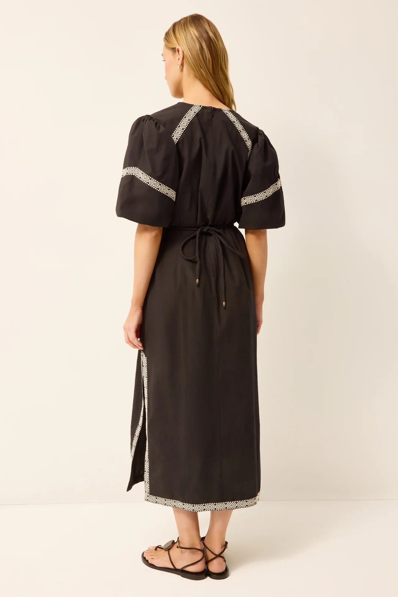 Fitted through the bust, waist, and hips, this brand-new style flatters in all the right places, but it’s the perfectly placed geometric embroidery that really elevates this sophisticated black-and-white midi dress.