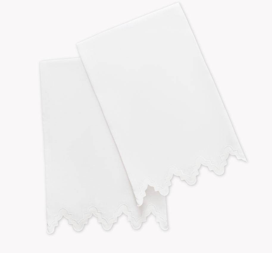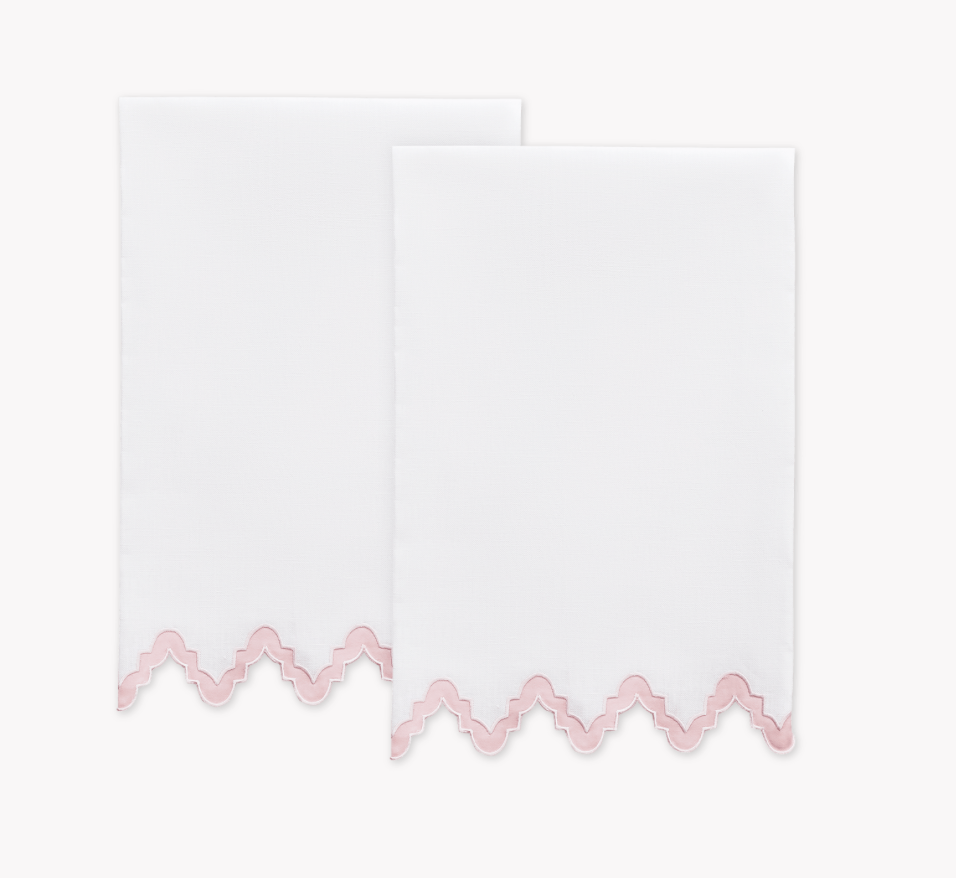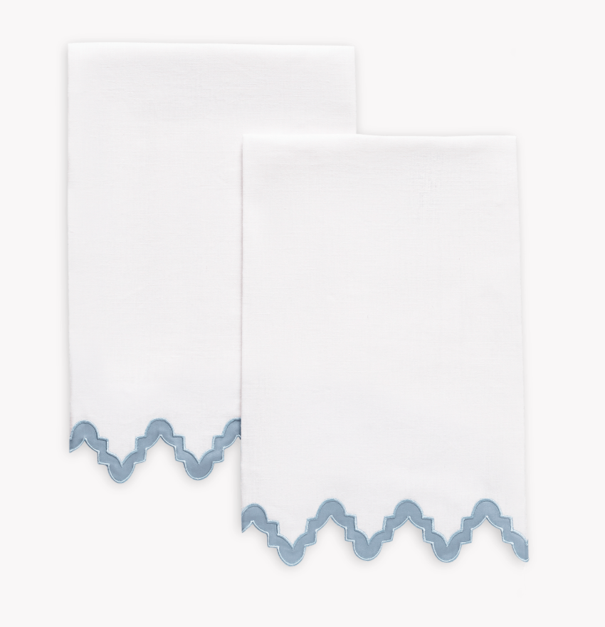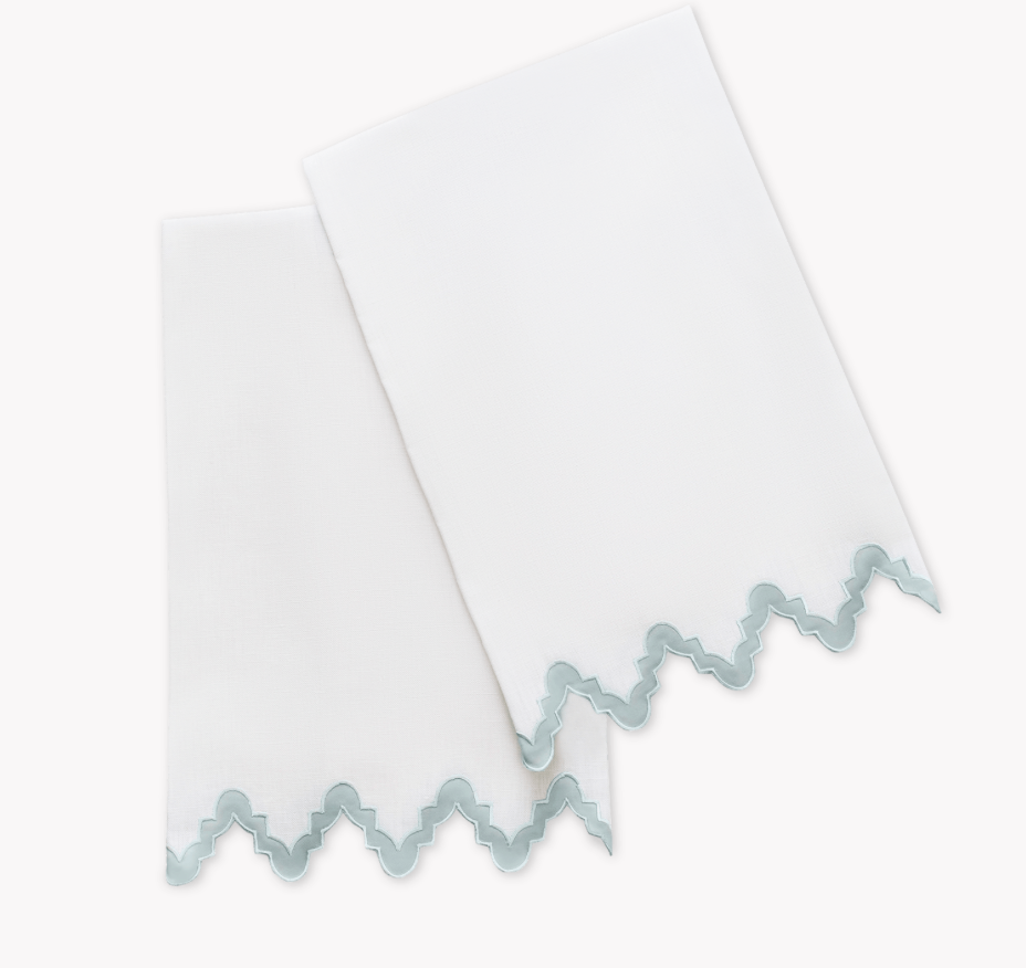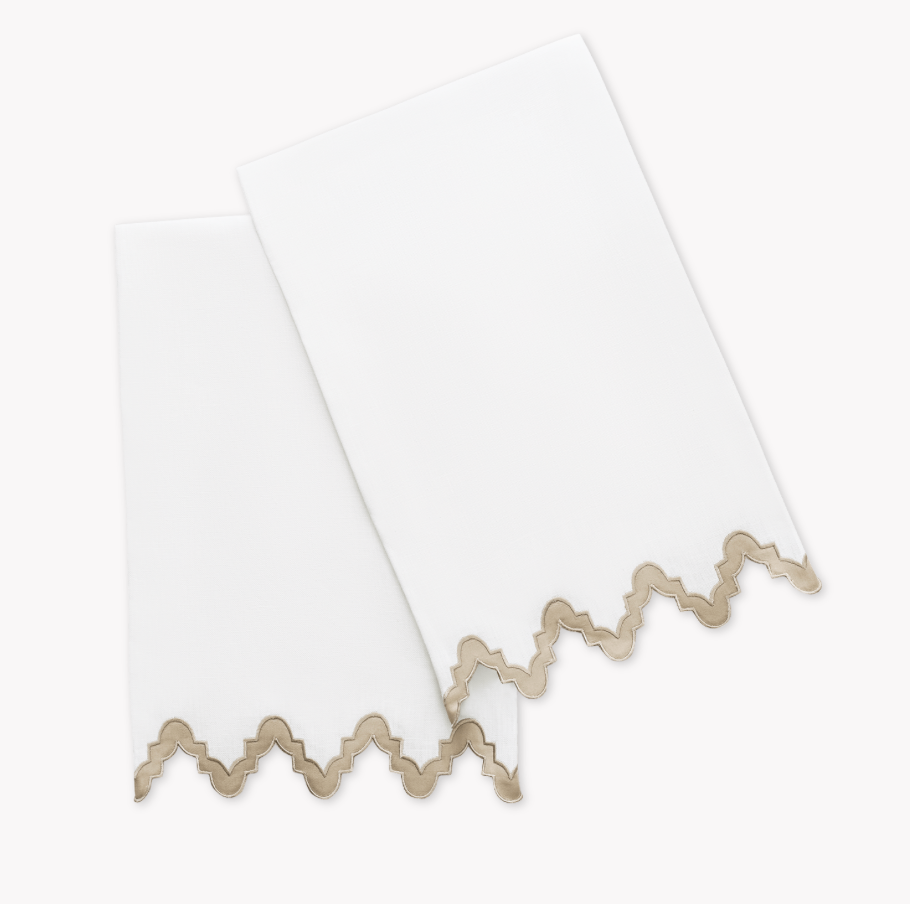 Aziza’s alluring zig-zag appliqué in Nocturne sateen adds flourish to linen guest towels, bringing distinctive design to everyday moments.
