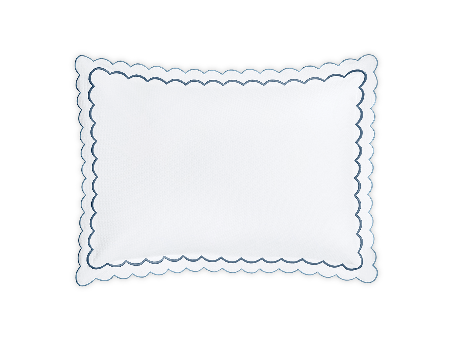 India owes its playful sophistication to an original take on embroidery. Along its narrow, scalloped flange are two carefully stitched lines in distinct tones. The 520 thread count Ceylon percale is the base fabric for this sweet, elegant collection.