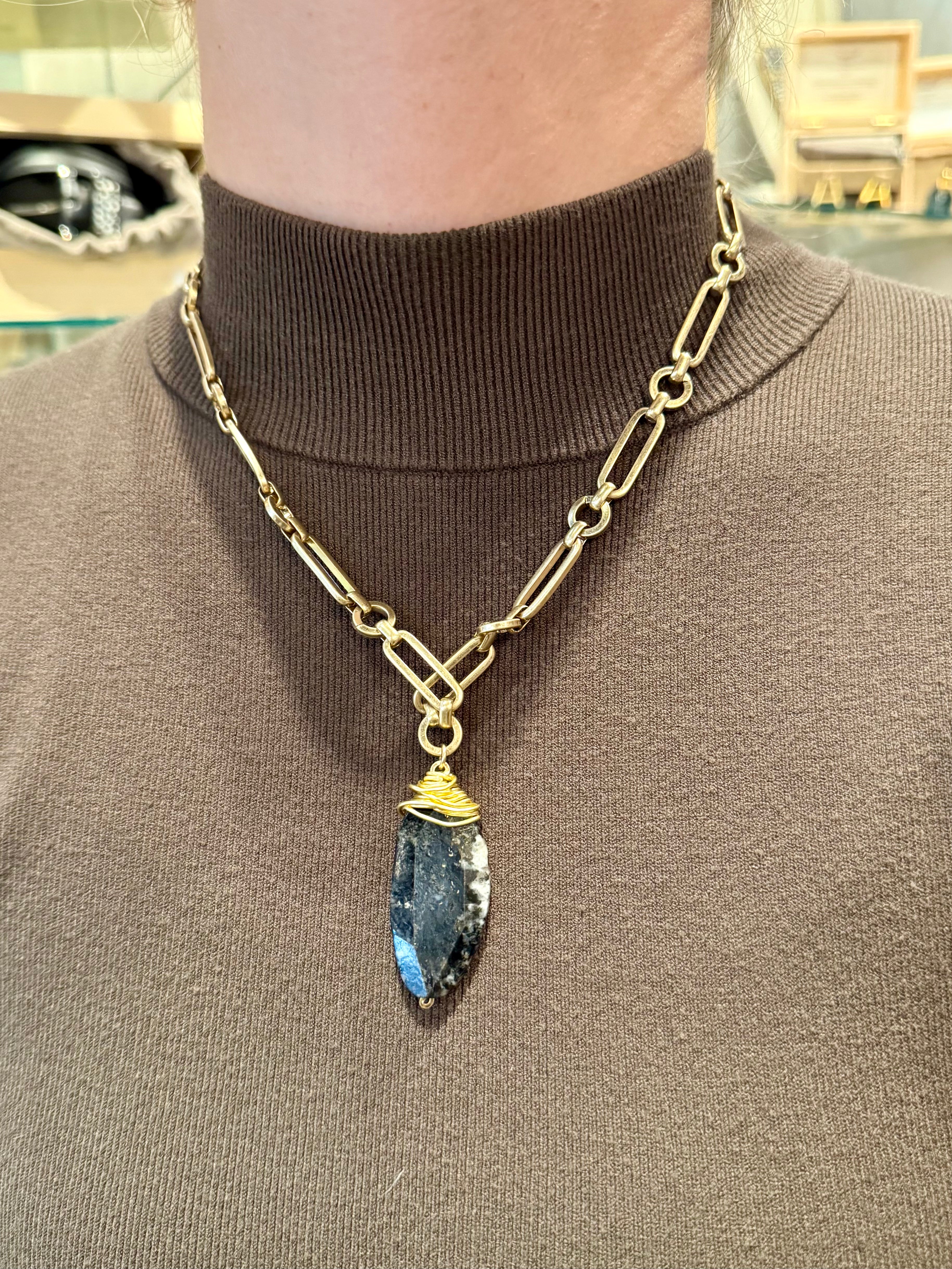 This elegant Black Agate Necklace features a striking polished stone pendant suspended from a lustrous gold plated brass chain. The piece is finished with a durable gold filled clasp and findings, ensuring both beauty and longevity. The deep, sophisticated black agate complements the warm gold tones perfectly, making it a versatile accessory for everyday wear or special occasions. A timeless addition to any jewelry collection.