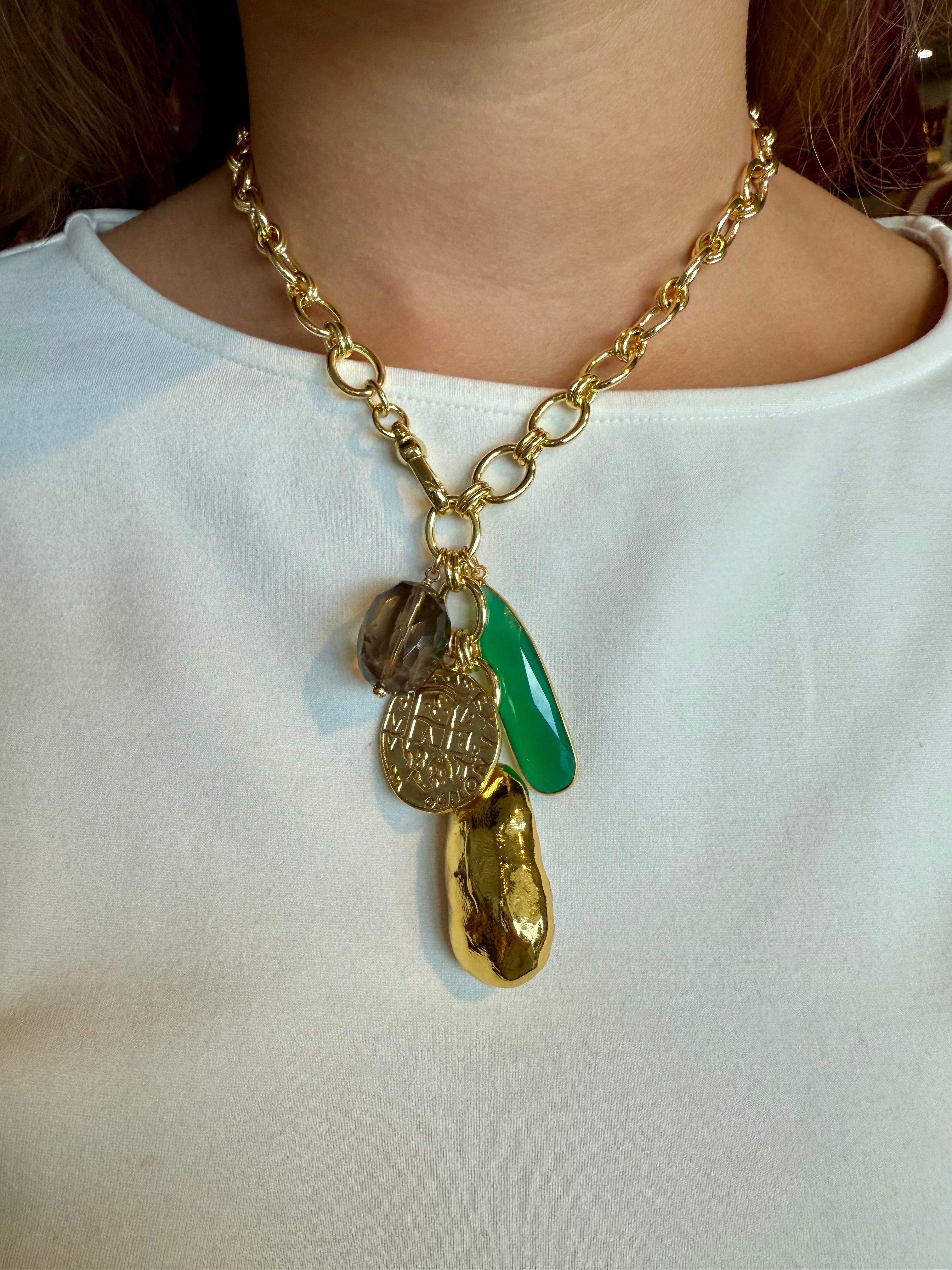 The Lucia Necklace features a delicate chain adorned with a striking green onyx chandelier drop, offering a unique blend of elegance and natural beauty. This piece adds a touch of vibrant color to any outfit while maintaining a refined and sophisticated look. Perfect for both everyday wear and special occasions.