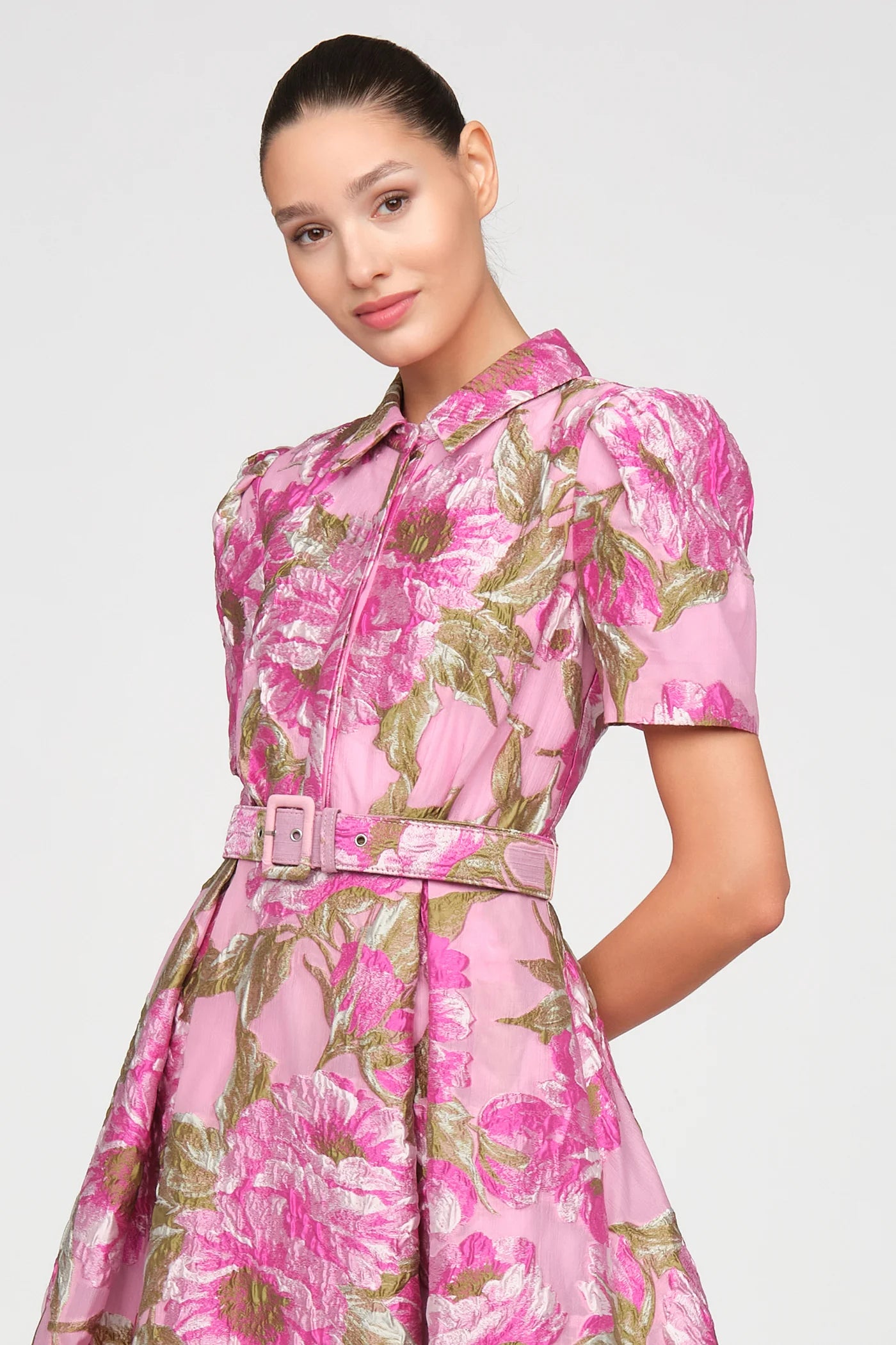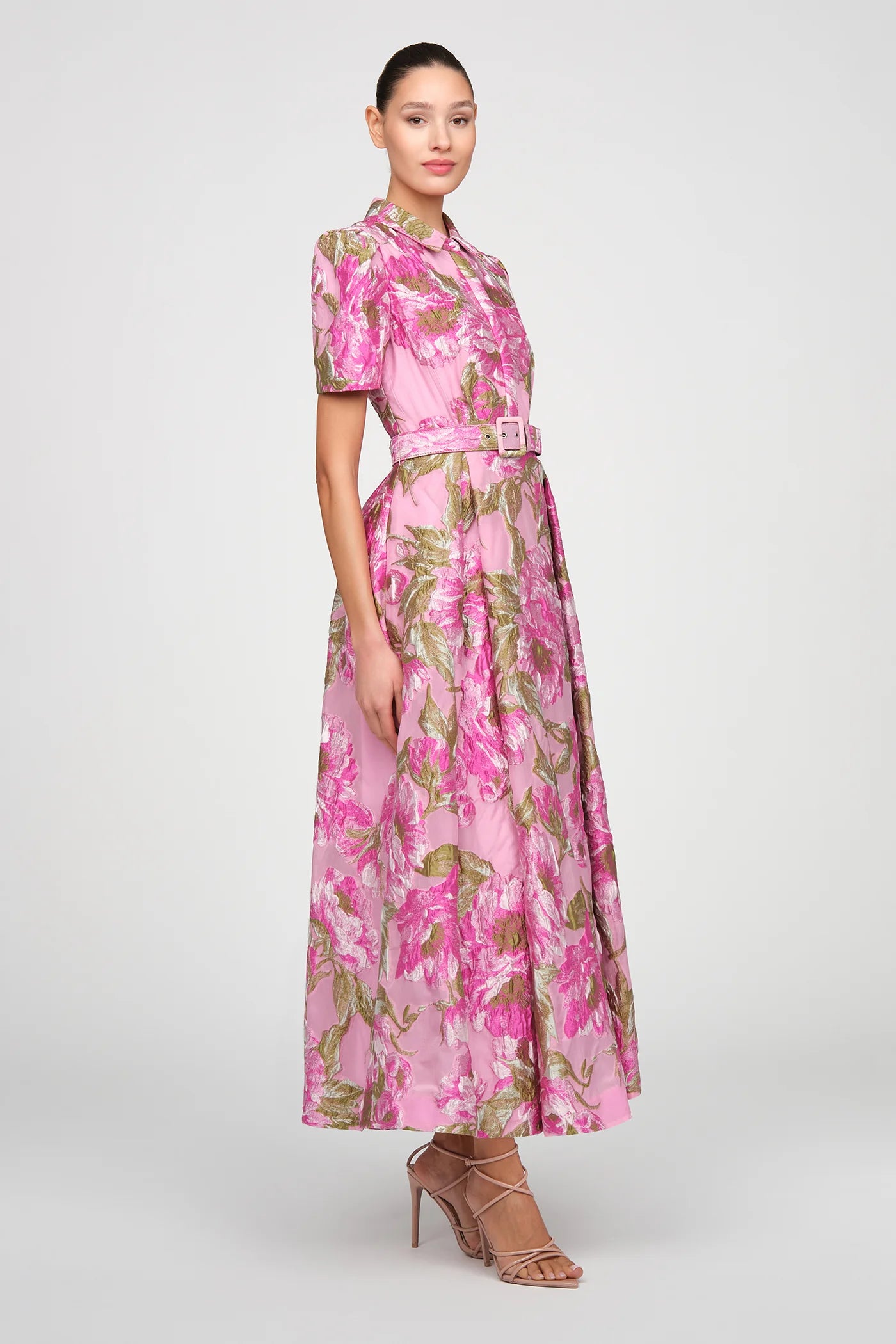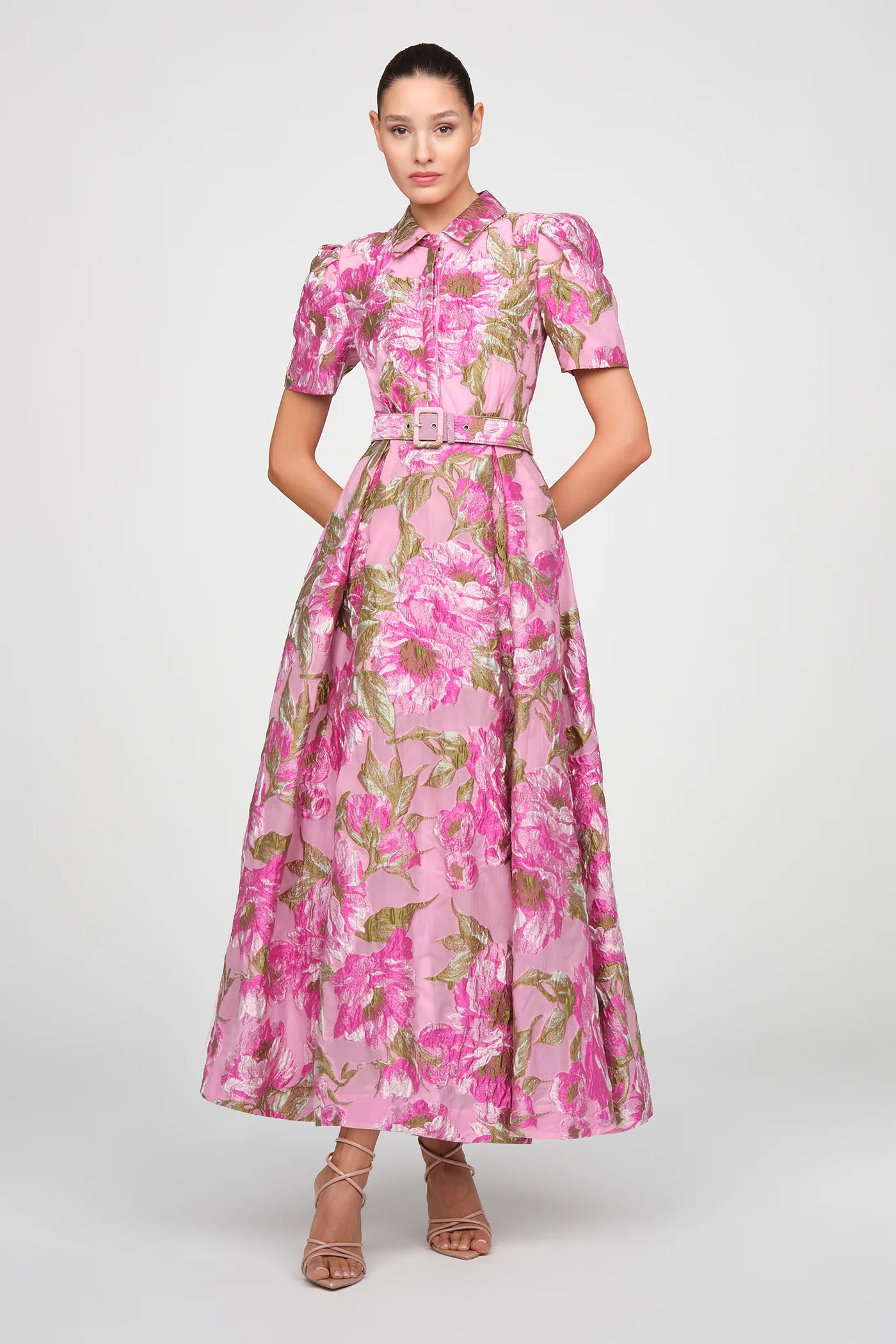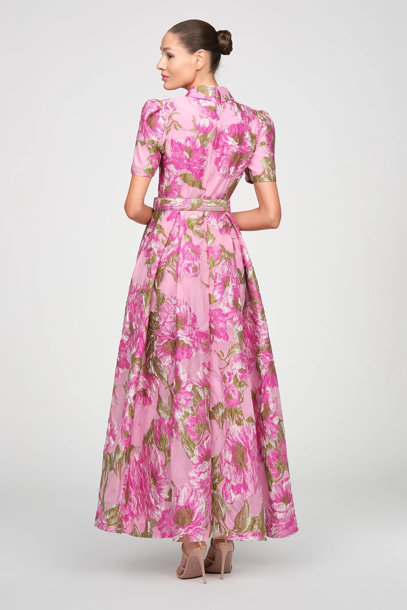 Floral jacquard ankle-length shirt dress, patterned with a painterly bouquet that glows across the textured surface. A tailored bodice and waist belt bring structure, balancing the fullness of the skirt with polished ease. A refined choice for garden ceremonies, daytime celebrations, and spring luncheons.