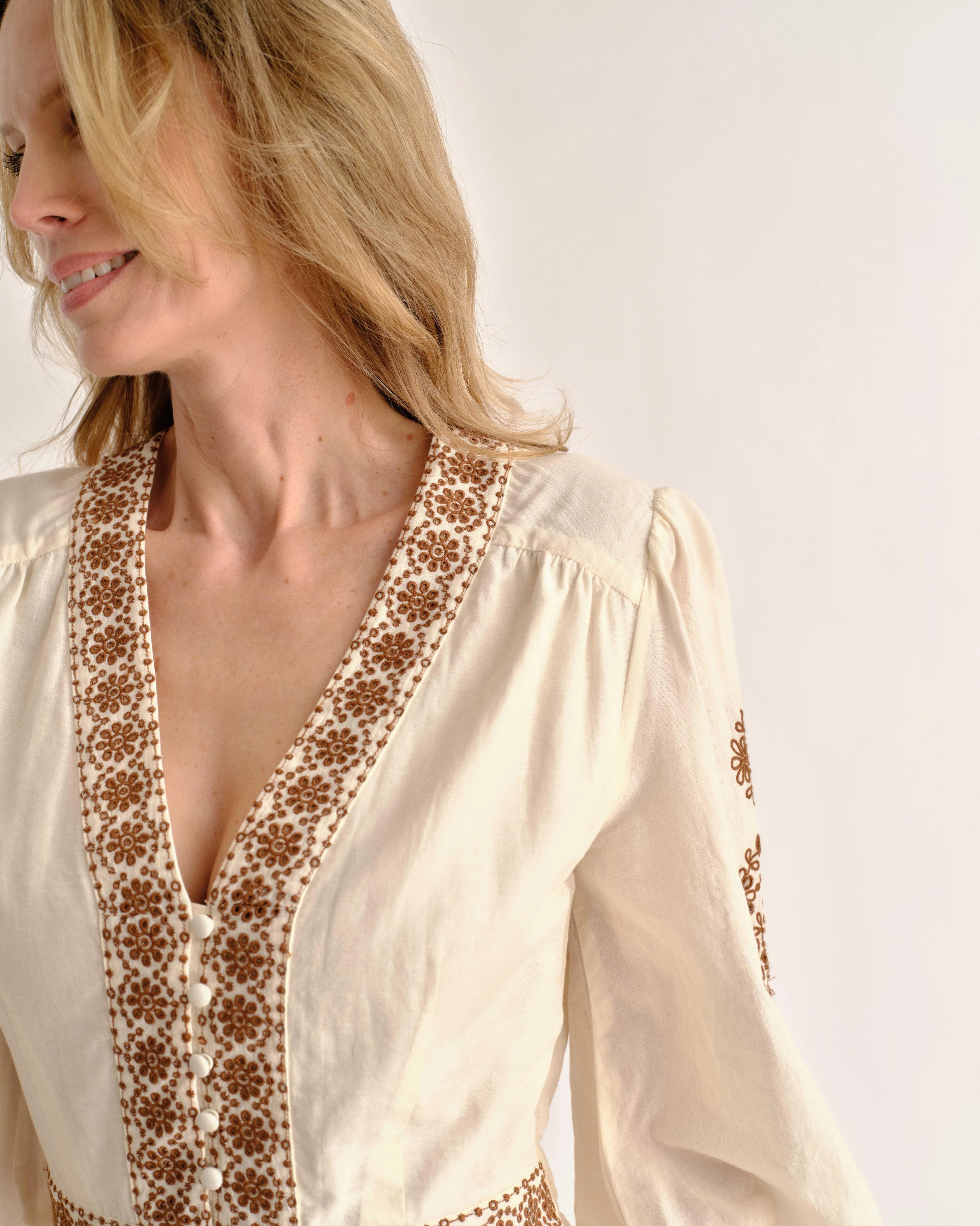- Full-length lantern sleeves with a smocked back cuff for adjustable comfort